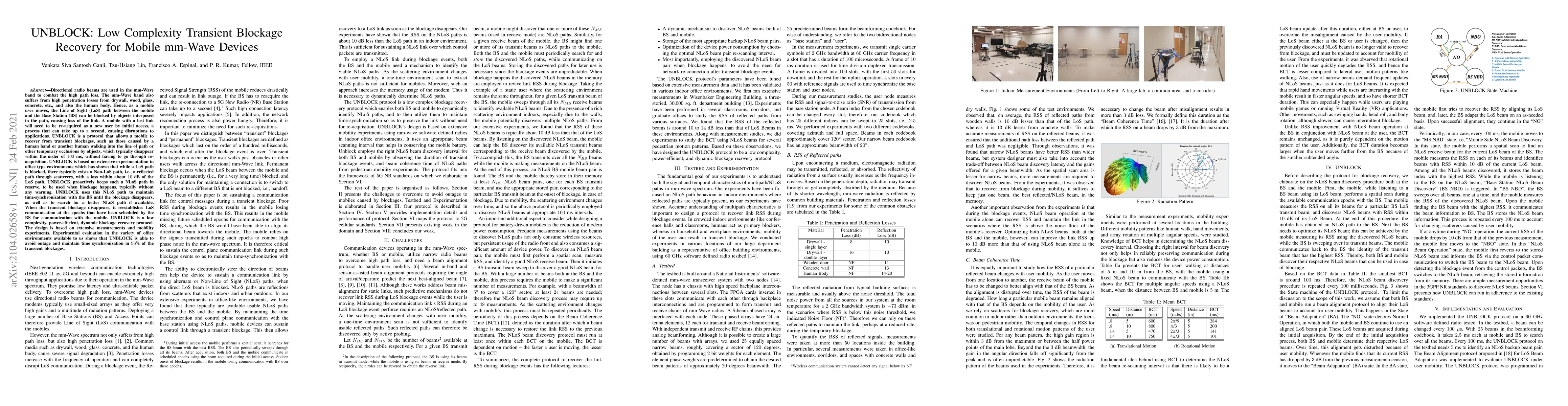 Directional radio beams are used in the mm-Wave band to combat the high path loss. The mm-Wave band also suffers from high penetration losses from drywall, wood, glass, concrete, etc., and also the human body. Hence, as a mobile user moves, the Line of Sight (LoS) path between the mobile and the Base Station (BS) can be blocked by objects interposed in the path, causing loss of the link. A mobile with a lost link will need to be re-acquired as a new user by initial access, a process that can take up to a second, causing disruptions to applications. UNBLOCK is a protocol that allows a mobile to recover from transient blockages, such as those caused by a human hand or another human walking into the line of path or other temporary occlusions by objects, which typically disappear within the order of $100$ ms, without having to go through re-acquisition. UNBLOCK is based on extensive experimentation in office type environments which has shown that while a LoS path is blocked, there typically exists a Non-LoS path, i.e., a reflected path through scatterers, with a loss within about $10$ dB of the LoS path. UNBLOCK proactively keeps such a NLoS path in reserve, to be used when blockage happens, typically without any warning. UNBLOCK uses this NLoS path to maintain time-synchronization with the BS until the blockage disappears, as well as to search for a better NLoS path if available. When the transient blockage disappears, it reestablishes LoS communication at the epochs that have been scheduled by the BS for communication with the mobile.