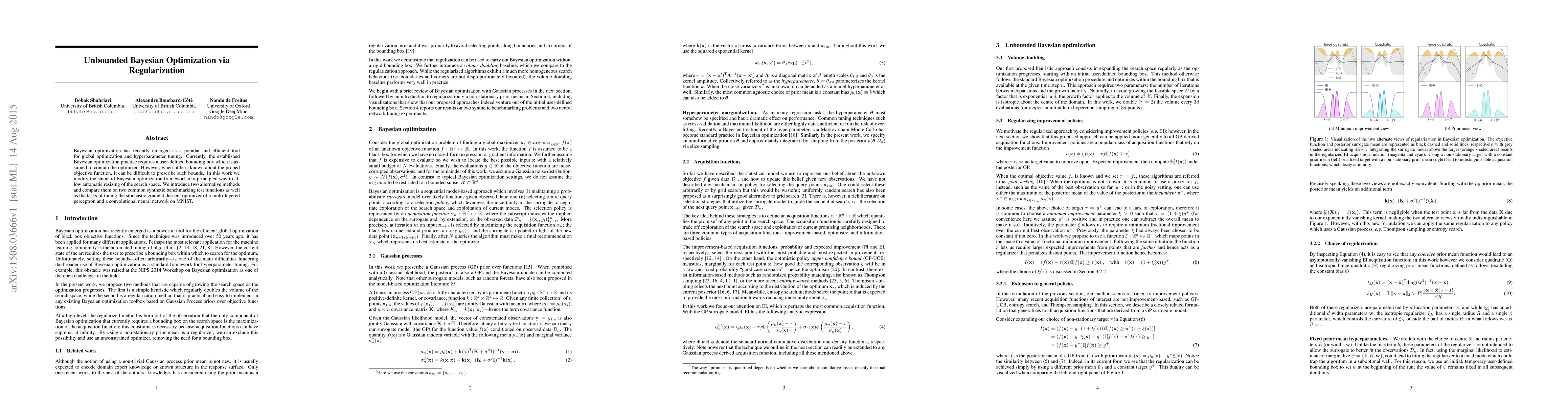 This paper proposes modifications to Bayesian optimization to allow automatic resizing of the search space without predefined bounds, introducing two alternative methods. It evaluates these methods on synthetic functions and neural network hyperparameter tuning tasks.
