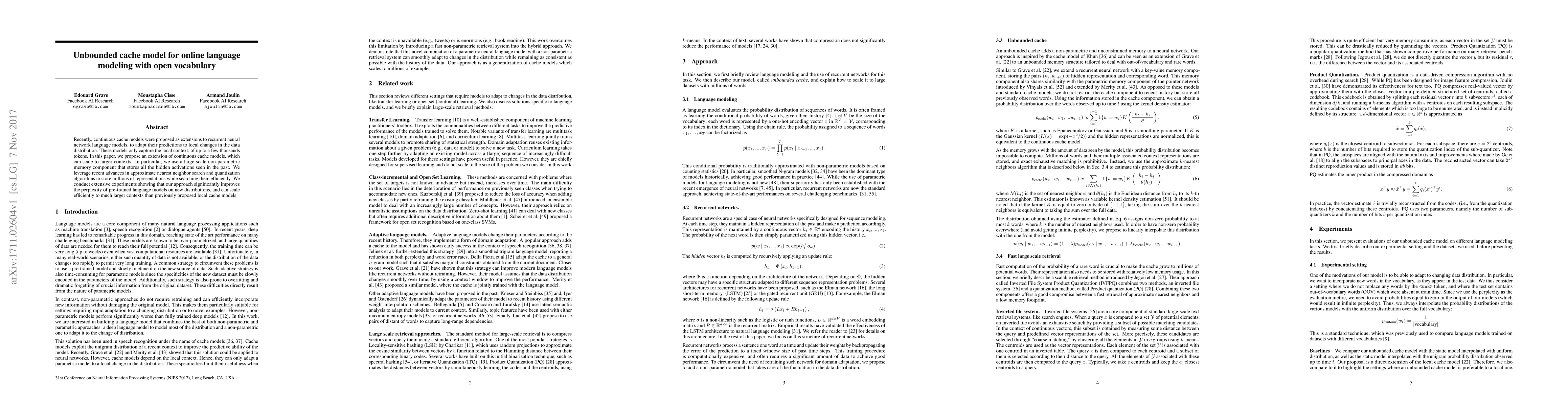 Recently, continuous cache models were proposed as extensions to recurrent neural network language models, to adapt their predictions to local changes in the data distribution. These models only capture the local context, of up to a few thousands tokens. In this paper, we propose an extension of continuous cache models, which can scale to larger contexts. In particular, we use a large scale non-parametric memory component that stores all the hidden activations seen in the past. We leverage recent advances in approximate nearest neighbor search and quantization algorithms to store millions of representations while searching them efficiently. We conduct extensive experiments showing that our approach significantly improves the perplexity of pre-trained language models on new distributions, and can scale efficiently to much larger contexts than previously proposed local cache models.