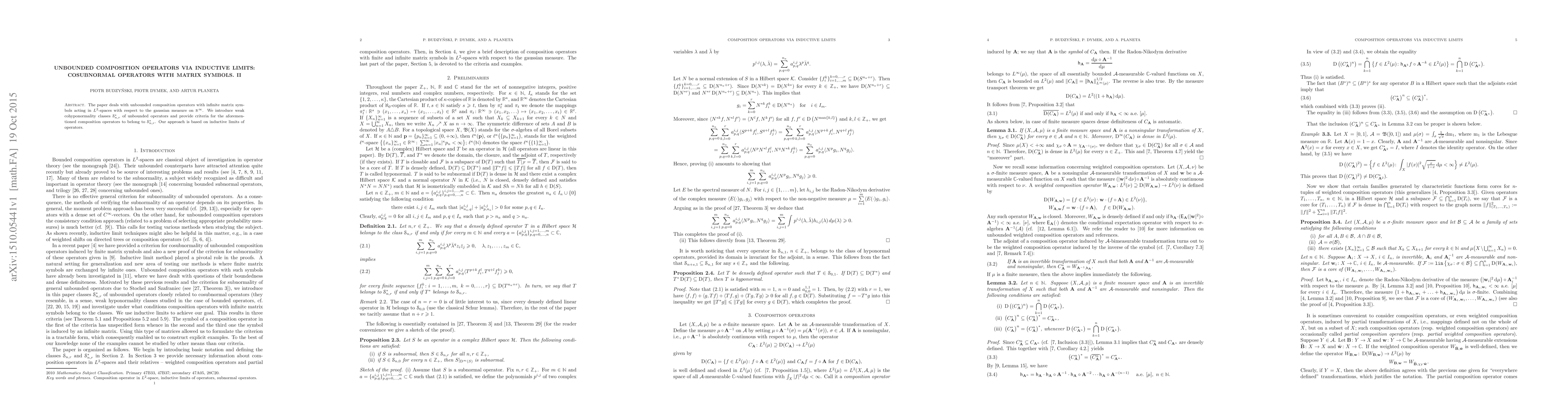 This paper explores unbounded composition operators with infinite matrix symbols in $L^2$-spaces over $\mathbb{R}^\infty$ with Gaussian measure. It introduces weak cohyponormality classes $\EuScript{S}_{n,r}^*$ and provides criteria for these operators to belong to these classes, utilizing an approach based on inductive limits of operators.