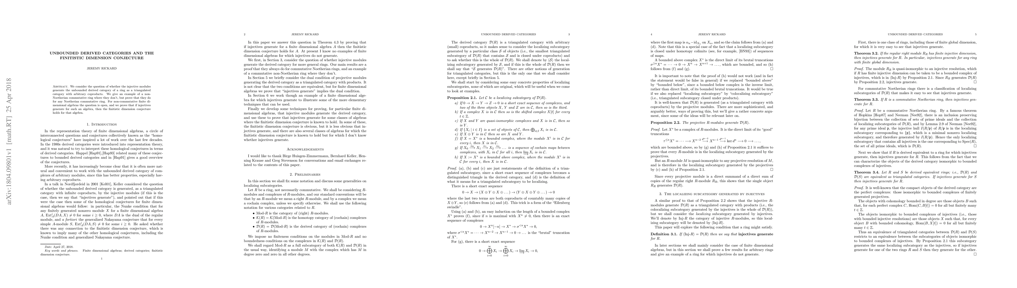 Researchers investigate whether injective modules generate the unbounded derived category of a ring in different algebraic settings, making progress on the finitistic dimension conjecture for some cases.