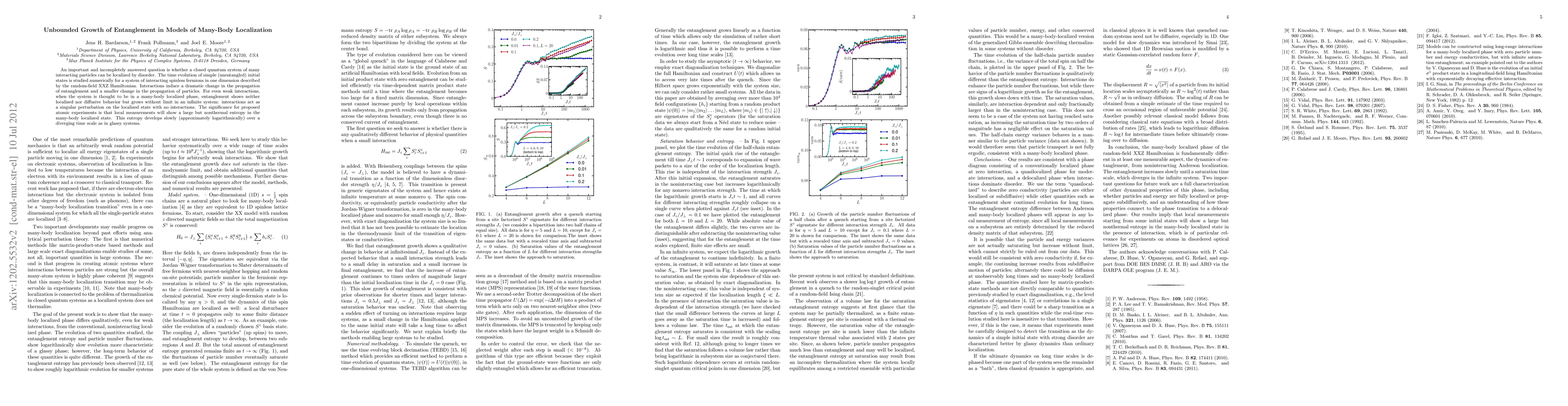 An important and incompletely answered question is whether a closed quantum system of many interacting particles can be localized by disorder. The time evolution of simple (unentangled) initial states is studied numerically for a system of interacting spinless fermions in one dimension described by the random-field XXZ Hamiltonian. Interactions induce a dramatic change in the propagation of entanglement and a smaller change in the propagation of particles. For even weak interactions, when the system is thought to be in a many-body localized phase, entanglement shows neither localized nor diffusive behavior but grows without limit in an infinite system: interactions act as a singular perturbation on the localized state with no interactions. The significance for proposed atomic experiments is that local measurements will show a large but nonthermal entropy in the many-body localized state. This entropy develops slowly (approximately logarithmically) over a diverging time scale as in glassy systems.