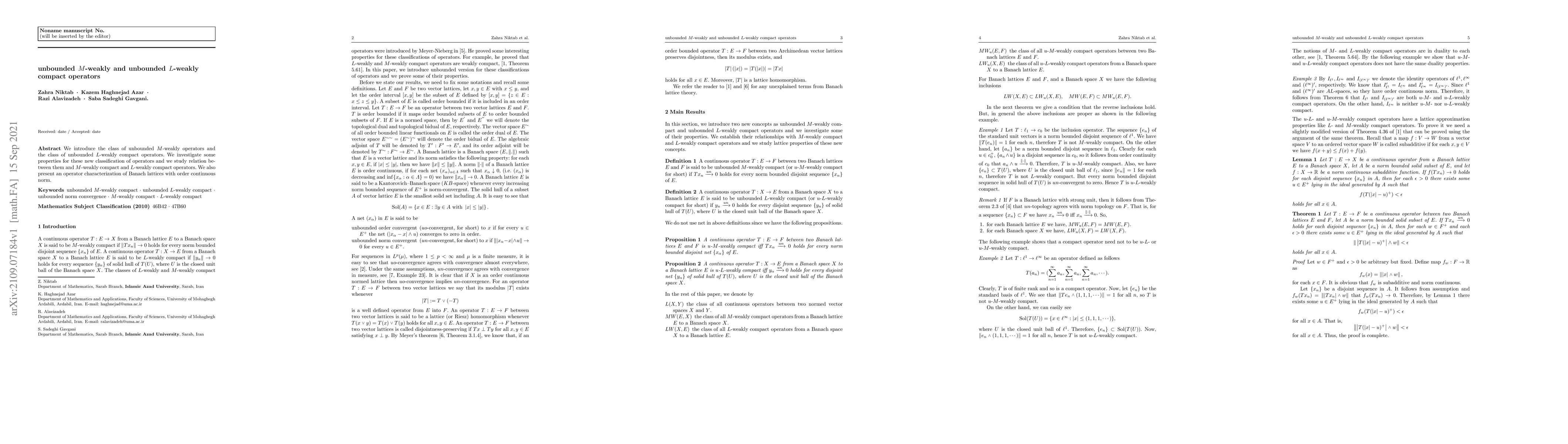 We introduce the class of unbounded $M$-weakly operators and the class of unbounded $L$-weakly compact operators. We investigate some properties for these new classification of operators and we study relation between them and $M$-weakly compact and $L$-weakly compact operators. We also present an operator characterization of Banach lattices with order continuous norm. \keywords{unbounded $M$-weakly compact \and unbounded $L$-weakly compact \and unbounded norm convergence \and $M$-weakly compact \and $L$-weakly compact