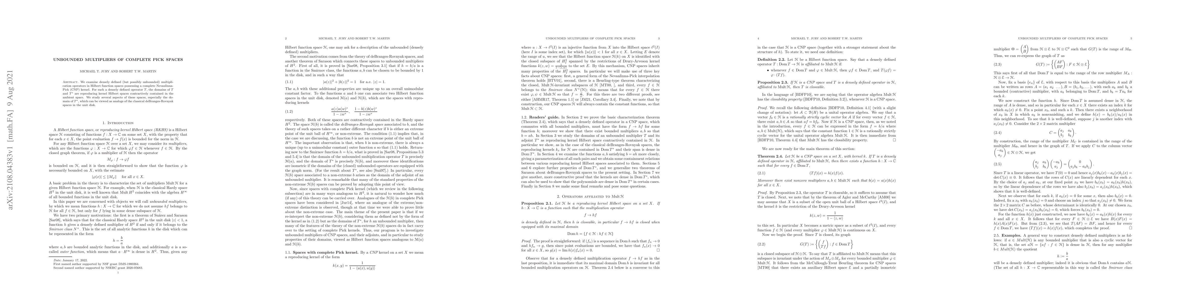 We examine densely defined (but possibly unbounded) multiplication operators in Hilbert function spaces possessing a complete Nevanlinna-Pick (CNP) kernel. For such a densely defined operator $T$, the domains of $T$ and $T^*$ are reproducing kernel Hilbert spaces contractively contained in the ambient space. We study several aspects of these spaces, especially the domain of $T^*$, which can be viewed as analogs of the classical deBranges-Rovnyak spaces in the unit disk.