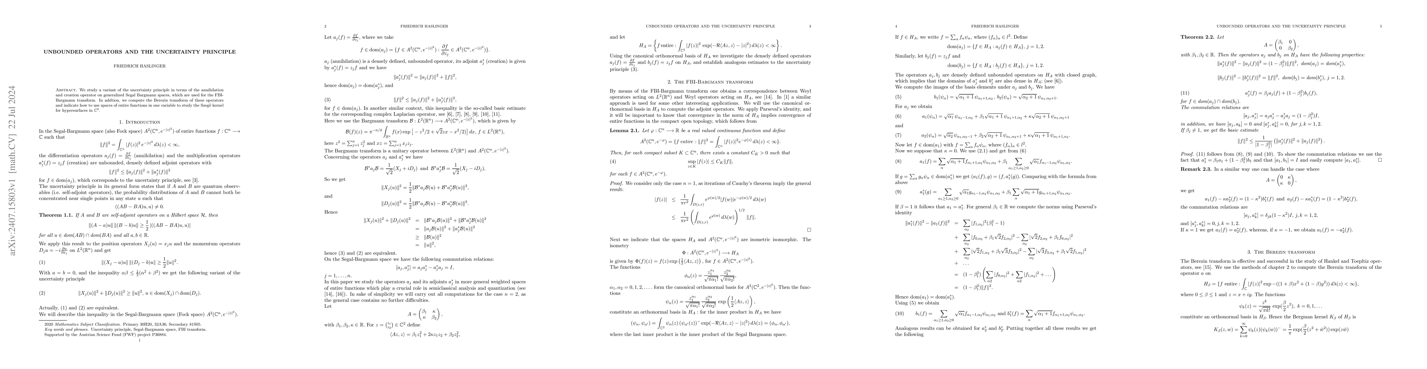 We study a variant of the uncertainty principle in terms of the annihilation and creation operator on generalized Segal Bargmann spaces, which are used for the FBI-Bargmann transform. In addition, we compute the Berezin transform of these operators and indicate how to use spaces of entire functions in one variable to study the Szeg\H{o} kernel for hypersurfaces in $\mathbb C^2.$