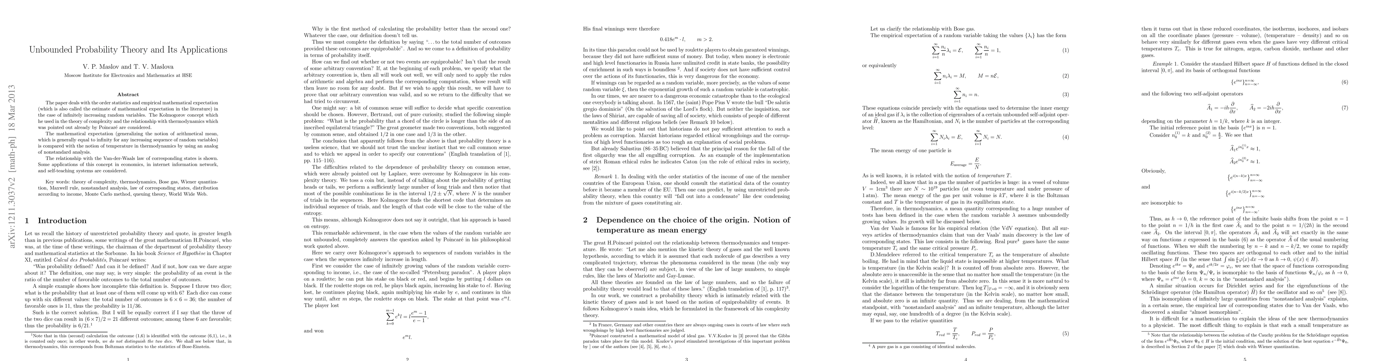 The paper deals with the order statistics and empirical mathematical expectation (which is also called the estimate of mathematical expectation in the literature) in the case of infinitely increasing random variables. The Kolmogorov concept which he used in the theory of complexity and the relationship with thermodynamics which was pointed out already by Poincar\'e are considered. The mathematical expectation (generalizing the notion of arithmetical mean, which is generally equal to infinity for any increasing sequence of random variables) is compared with the notion of temperature in thermodynamics by using an analog of nonstandard analysis. The relationship with the Van-der-Waals law of corresponding states is shown. Some applications of this concept in economics, in internet information network, and self-teaching systems are considered.