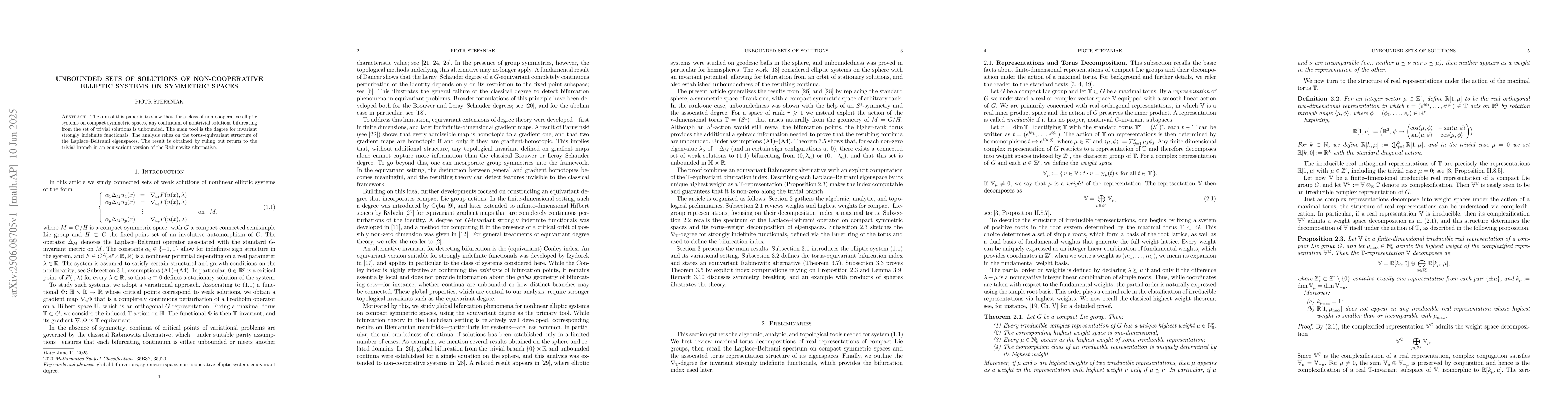 The aim of this paper is to show that, for a class of non-cooperative elliptic systems on compact symmetric spaces, any continuum of nontrivial solutions bifurcating from the set of trivial solutions is unbounded. The main tool is the degree for invariant strongly indefinite functionals. The analysis relies on the torus-equivariant structure of the Laplace--Beltrami eigenspaces. The result is obtained by ruling out return to the trivial branch in an equivariant version of the Rabinowitz alternative.