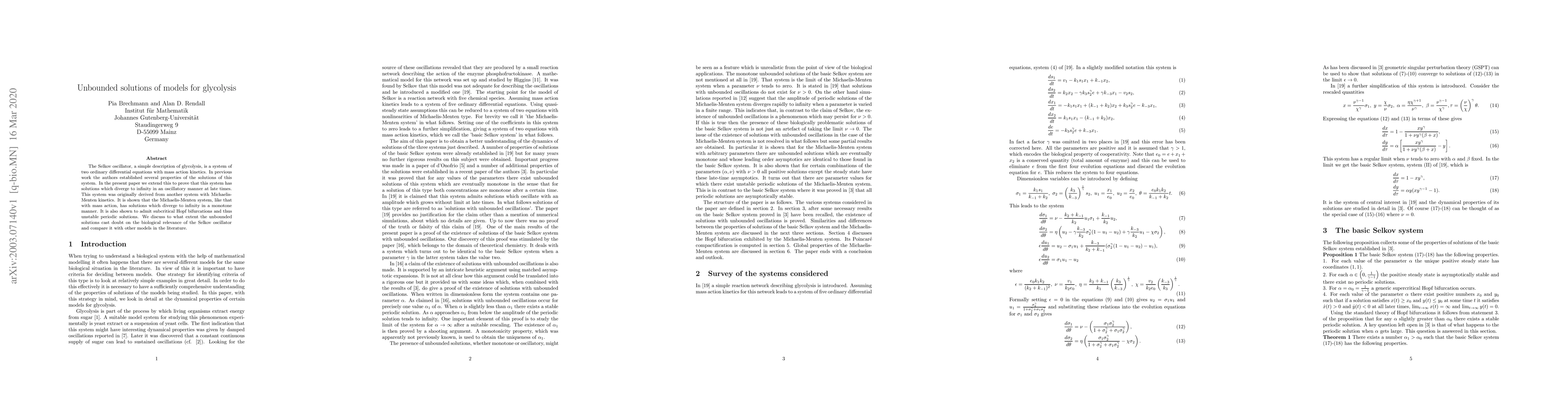 The Selkov oscillator, a simple description of glycolysis, is a system of two ordinary differential equations with mass action kinetics. In previous work the authors established several properties of the solutions of this system. In the present paper we extend this to prove that this system has solutions which diverge to infinity in an oscillatory manner at late times. This system was originally derived from another system with Michaelis-Menten kinetics. It is shown that the Michaelis-Menten system, like that with mass action, has solutions which diverge to infinity in a monotone manner. It is also shown to admit subcritical Hopf bifurcations and thus unstable periodic solutions. We discuss to what extent the unbounded solutions cast doubt on the biological relevance of the Selkov oscillator and compare it with other models in the literature.