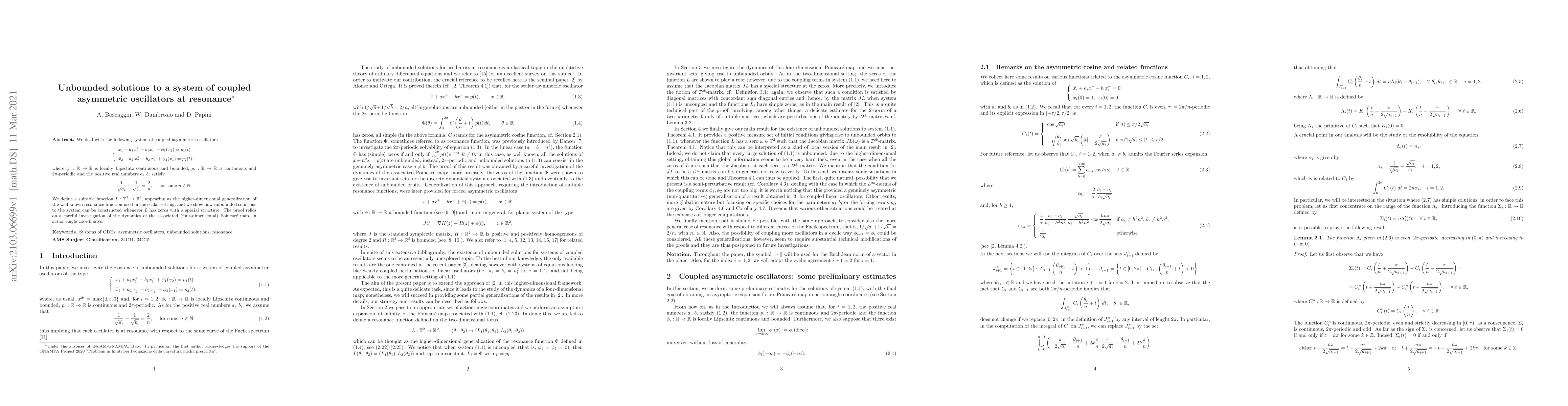We deal with the following system of coupled asymmetric oscillators \[ \begin{cases} \ddot{x}_1+a_1x_1^+-b_1x^-_1+\phi_1(x_2)=p_1(t) \\ \ddot{x}_2+a_2\,x_2^+-b_2\,x^-_2+\phi_2(x_1)=p_2(t) \end{cases} \] where $\phi_i: \mathbb{R} \to \mathbb{R}$ is locally Lipschitz continuous and bounded, $p_i: \mathbb{R} \to \mathbb{R}$ is continuous and $2\pi$-periodic and the positive real numbers $a_i, b_i$ satisfy $$ \dfrac{1}{\sqrt{a_i}}+\dfrac{1}{\sqrt{b_i}}=\dfrac{2}{n}, \quad \mbox{ for some } n \in \mathbb{N}. $$ We define a suitable function $L: \mathbb{T}^2 \to \mathbb{R}^2$, appearing as the higher-dimensional generalization of the well known resonance function used in the scalar setting, and we show how unbounded solutions to the system can be constructed whenever $L$ has zeros with a special structure. The proof relies on a careful investigation of the dynamics of the associated (four-dimensional) Poincar\'e map, in action-angle coordinates.