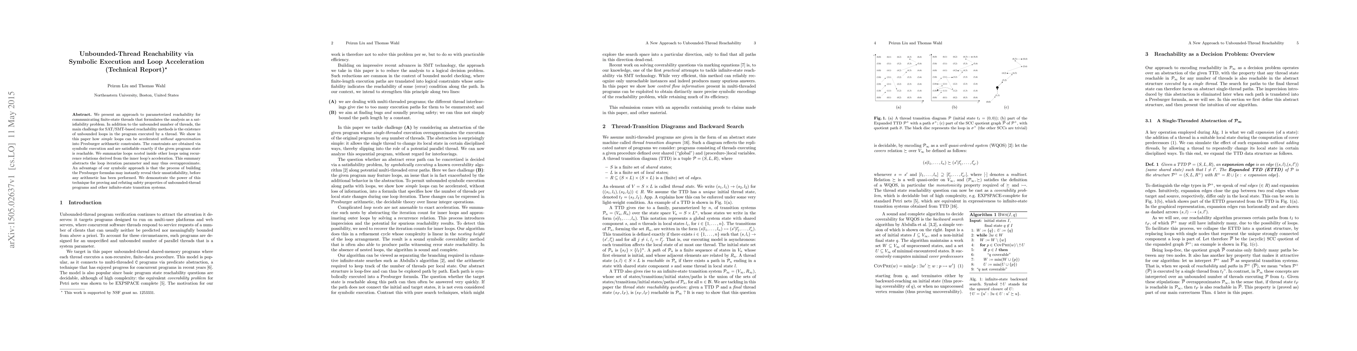 We present an approach to parameterized reachability for communicating finite-state threads that formulates the analysis as a satisfiability problem. In addition to the unbounded number of threads, the main challenge for SAT/SMT-based reachability methods is the existence of unbounded loops in the program executed by a thread. We show in this paper how simple loops can be accelerated without approximation into Presburger arithmetic constraints. The constraints are obtained via symbolic execution and are satisfiable exactly if the given program state is reachable. We summarize loops nested inside other loops using recurrence relations derived from the inner loop's acceleration. This summary abstracts the loop iteration parameter and may thus overapproximate. An advantage of our symbolic approach is that the process of building the Presburger formulas may instantly reveal their unsatisfiability, before any arithmetic has been performed. We demonstrate the power of this technique for proving and refuting safety properties of unbounded-thread programs and other infinite-state transition systems.