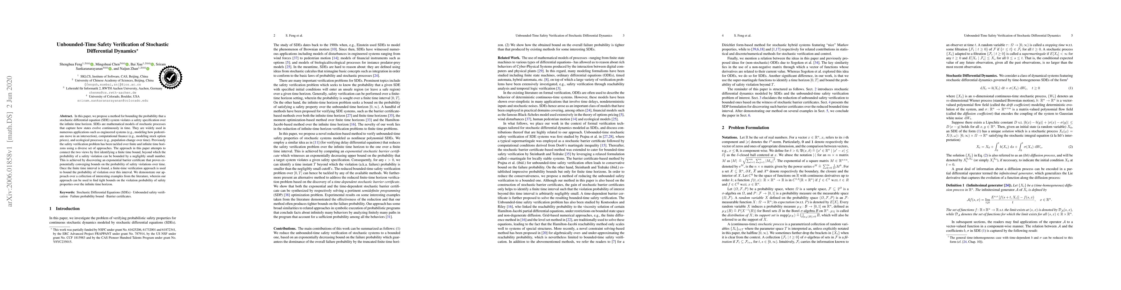 This paper proposes a method to bound the probability of safety violations in stochastic differential equation systems over infinite time, using an exponential barrier certificate to identify a finite time interval where violations are negligible. The approach combines finite-time verification techniques to achieve tight bounds on safety properties.