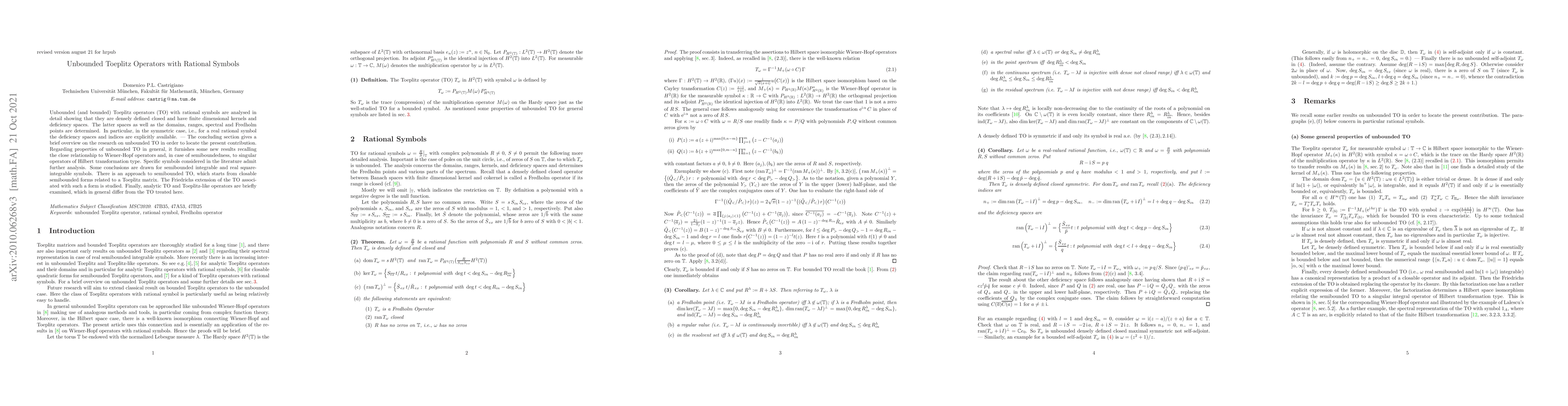The paper presents a comprehensive analysis of unbounded Toeplitz operators with rational symbols, determining their key properties and offering new insights into their relationship with Wiener-Hopf and singular operators.