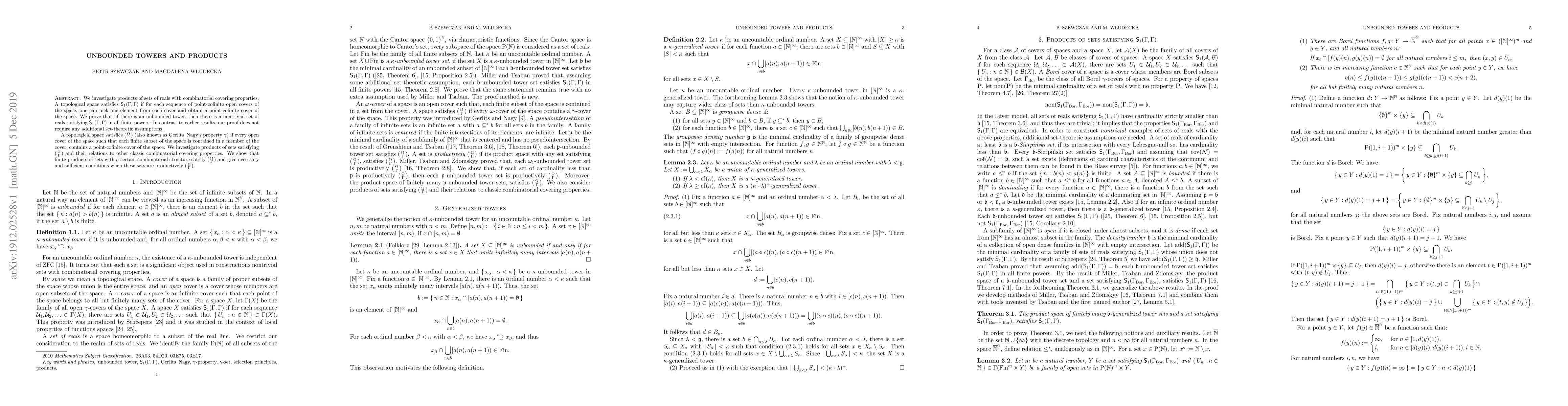We investigate products of sets of reals with combinatorial covering properties. A topological space satisfies $\mathsf{S}_1(\Gamma,\Gamma)$ if for each sequence of point-cofinite open covers of the space, one can pick one element from each cover and obtain a point-cofinite cover of the space. We prove that, if there is an unbounded tower, then there is a nontrivial set of reals satisfying $\mathsf{S}_1(\Gamma,\Gamma)$ in all finite powers. In contrast to earlier results, our proof does not require any additional set-theoretic assumptions. A topological space satisfies $\Omega\choose\Gamma$ (also known as Gerlits--Nagy's property $\gamma$) if every open cover of the space such that each finite subset of the space is contained in a member of the cover, contains a point-cofinite cover of the space. We investigate products of sets satisfying $\Omega\choose\Gamma$ and their relations to other classic combinatorial covering properties. We show that finite products of sets with a certain combinatorial structure satisfy $\Omega\choose\Gamma$ and give necessary and sufficient conditions when these sets are productively $\Omega\choose\Gamma$.