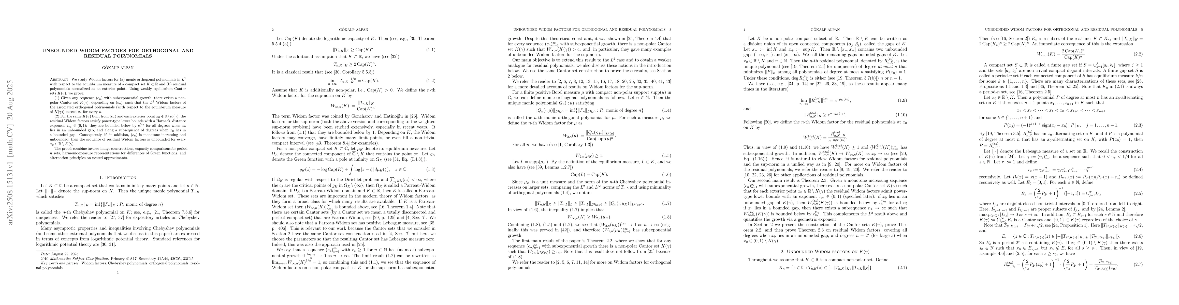 We study Widom factors for (a) monic orthogonal polynomials in $L^2$ with respect to the equilibrium measure of a compact set $K\subset\mathbb{R}$ and (b) residual polynomials normalized at an exterior point. Using weakly equilibrium Cantor sets $K(\gamma)$, we prove: (1) Given any sequence $(c_n)$ with subexponential growth, there exists a non-polar Cantor set $K(\gamma)$, depending on $(c_n)$, such that the $L^2$ Widom factors of the associated orthogonal polynomials (with respect to the equilibrium measure of $K(\gamma)$) exceed $c_n$ for every $n$. (2) For the same $K(\gamma)$ built from $(c_n)$ and each exterior point $x_0\in\mathbb{R}\setminus K(\gamma)$, the residual Widom factors satisfy power-type lower bounds with a Harnack-distance exponent $\tau_{x_0}\in(0,1)$: they are bounded below by $c_n^{\tau_{x_0}}$ for all degrees when $x_0$ lies in an unbounded gap, and along a subsequence of degrees when $x_0$ lies in a bounded gap. Consequently, if, in addition, $(c_n)$ is monotone increasing and unbounded, then the sequence of residual Widom factors is unbounded for every $x_0\in\mathbb{R}\setminus K(\gamma)$. The proofs combine inverse-image constructions, capacity comparisons for period-$n$ sets, harmonic-measure representations for differences of Green functions, and alternation principles on nested approximants.