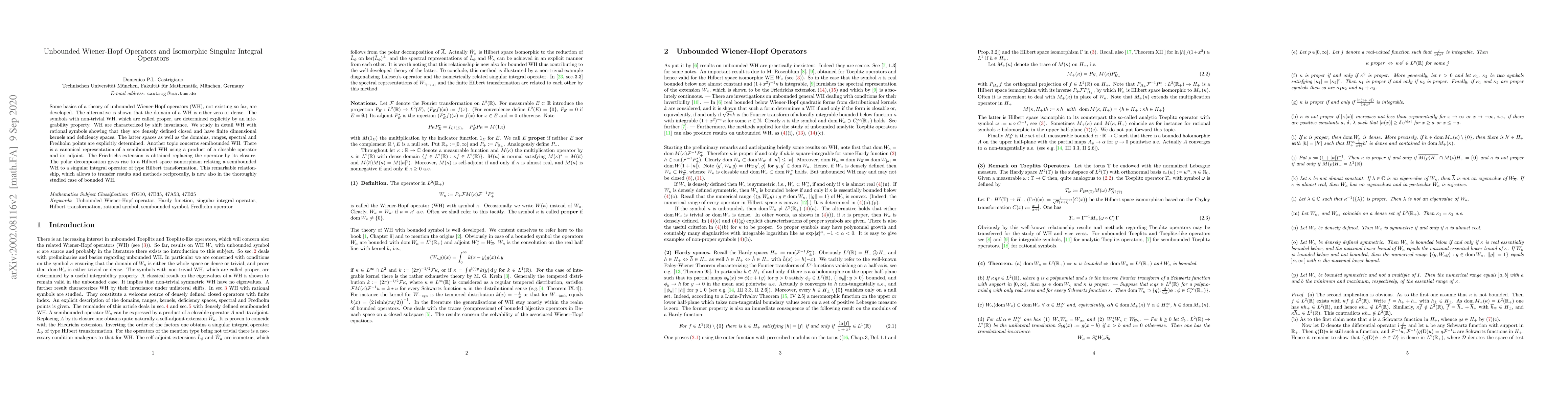 This paper explores unbounded Wiener-Hopf operators, demonstrating their dense definition, closed nature, and finite-dimensional kernels and deficiency spaces. It also investigates semibounded WH, showing their equivalence to singular integral operators via Hilbert space isomorphism.