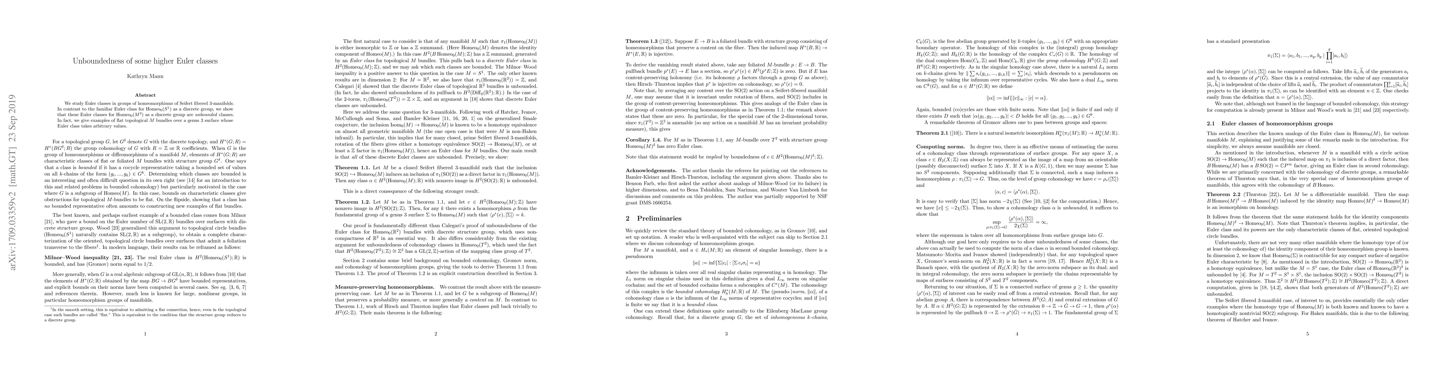 In this paper, we study Euler classes in groups of homeomorphisms of Seifert fibered 3-manifolds. We show that, in contrast to the familiar Euler class for $\mathrm{Homeo}_0(S^1)^\delta$, these Euler classes for $\mathrm{Homeo}_0(M^3)^\delta$ are unbounded classes. In fact, we give examples of flat topological M bundles over a genus 3 surface whose Euler class takes arbitrary values.