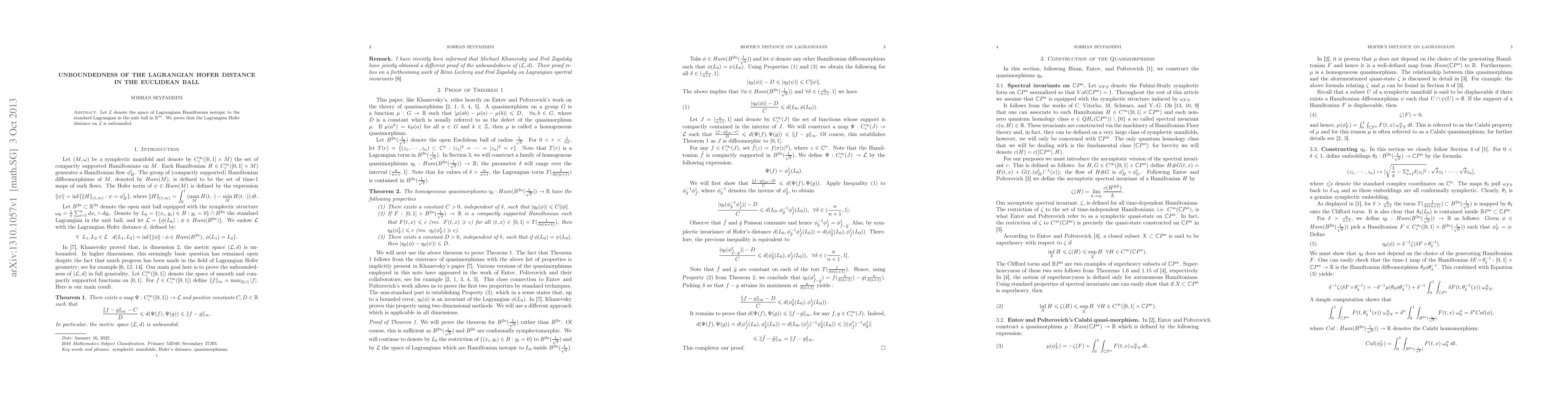 Let L denote the space of Lagrangians Hamiltonian isotopic to the standard Lagrangian in the unit ball in Euclidean space. We prove that the Lagrangian Hofer distance on L is unbounded.