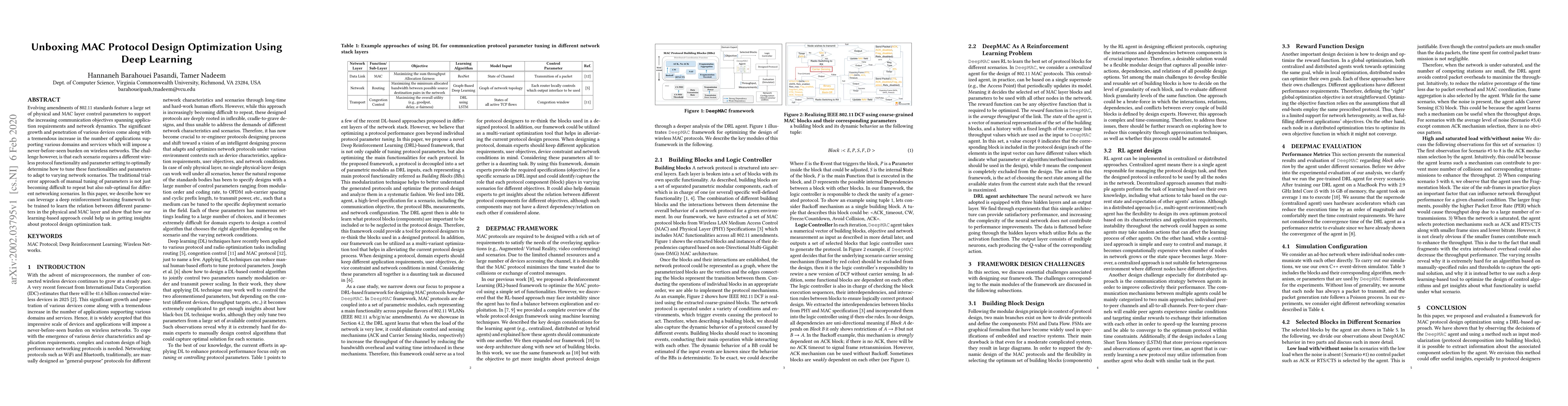 Evolving amendments of 802.11 standards feature a large set of physical and MAC layer control parameters to support the increasing communication objectives spanning application requirements and network dynamics. The significant growth and penetration of various devices come along with a tremendous increase in the number of applications supporting various domains and services which will impose a never-before-seen burden on wireless networks. The challenge however, is that each scenario requires a different wireless protocol functionality and parameter setting to optimally determine how to tune these functionalities and parameters to adapt to varying network scenarios. The traditional trial-error approach of manual tuning of parameters is not just becoming difficult to repeat but also sub-optimal for different networking scenarios. In this paper, we describe how we can leverage a deep reinforcement learning framework to be trained to learn the relation between different parameters in the physical and MAC layer and show that how our learning-based approach could help us in getting insights about protocol design optimization task.