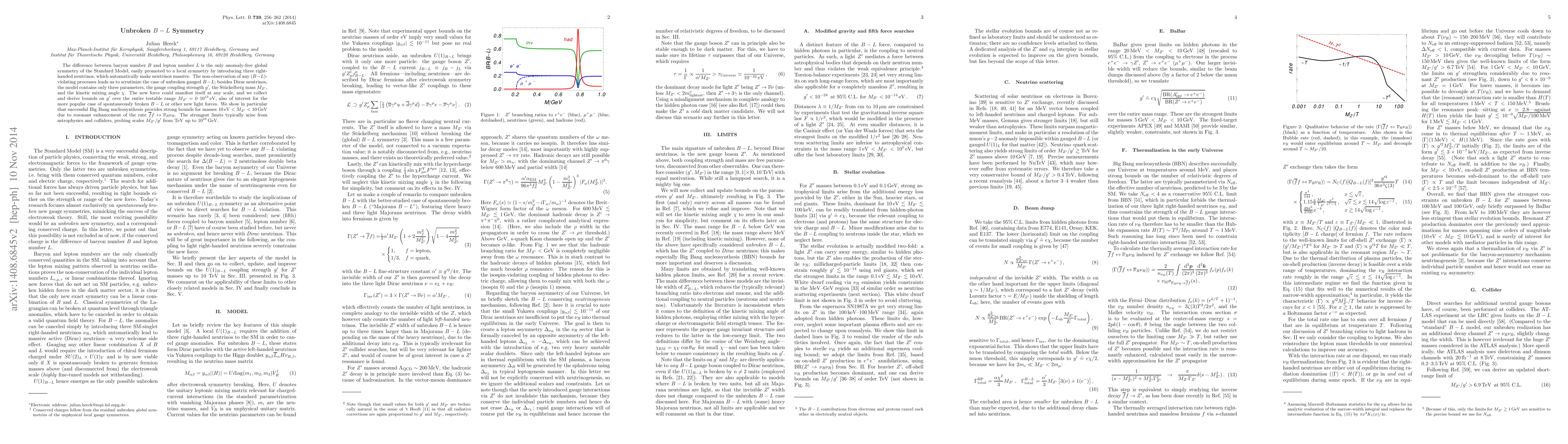 The difference between baryon number B and lepton number L is the only anomaly-free global symmetry of the Standard Model, easily promoted to a local symmetry by introducing three right-handed neutrinos, which automatically make neutrinos massive. The non-observation of any (B-L)-violating processes leads us to scrutinize the case of unbroken gauged B-L; besides Dirac neutrinos, the model contains only three parameters, the gauge coupling strength g', the Stueckelberg mass $M_{Z'}$, and the kinetic mixing angle $\chi$. The new force could manifest itself at any scale, and we collect and derive bounds on g' over the entire testable range $M_{Z'}$ = 0 - $10^{13}$ eV, also of interest for the more popular case of spontaneously broken B-L or other new light forces. We show in particular that successful Big Bang nucleosynthesis provides strong bounds for masses 10 eV < $M_{Z'}$ < 10 GeV due to resonant enhancement of the rate $\bar{f} f \leftrightarrow \bar{\nu}_R \nu_R$. The strongest limits typically arise from astrophysics and colliders, probing scales $M_{Z'}/g'$ from TeV up to $10^{10}$ GeV.