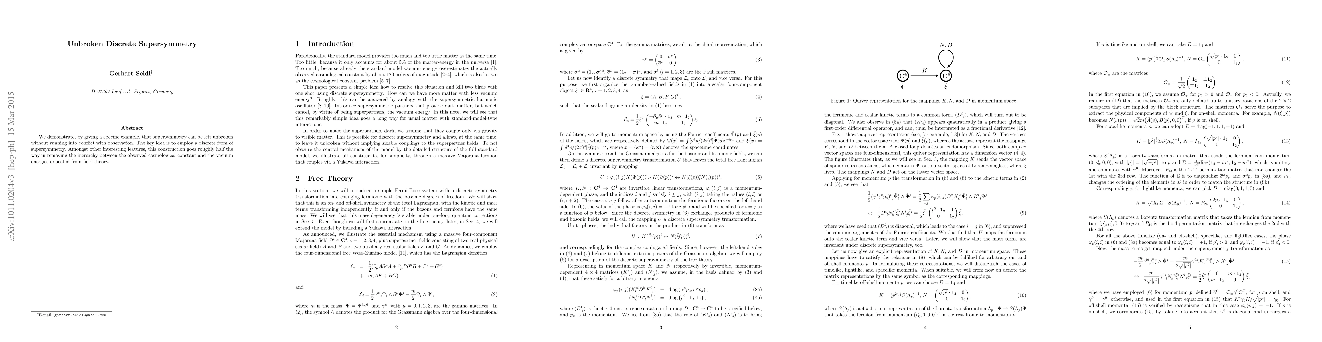 Summary: This paper presents a specific example of unbroken discrete supersymmetry that avoids observational conflicts, and it partially resolves the hierarchy problem between the cosmological constant and vacuum energies.