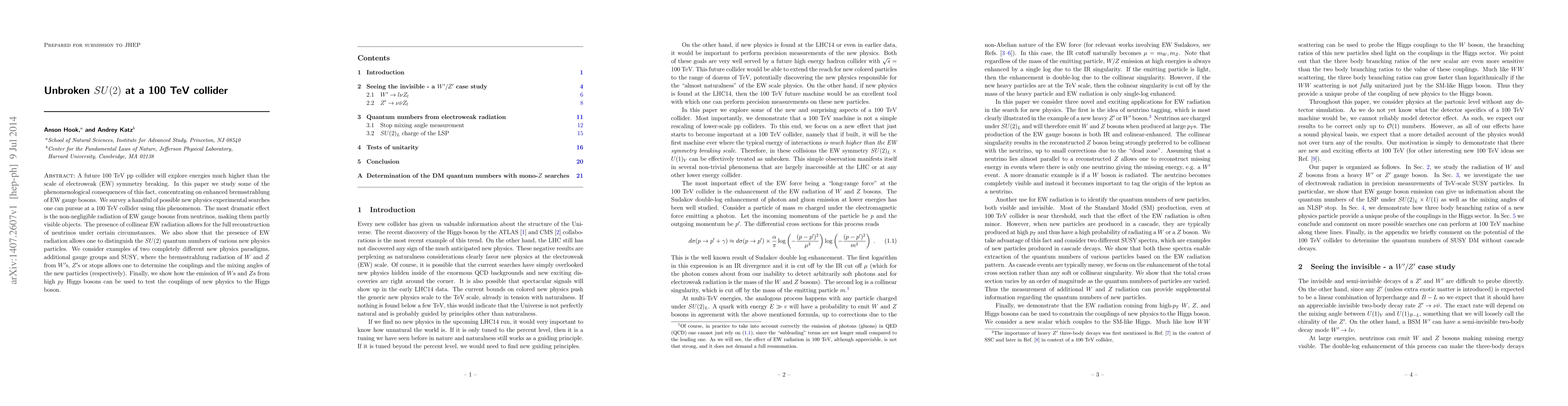 This paper investigates the potential of a future 100 TeV collider to explore high-energy phenomena beyond the electroweak symmetry breaking scale, focusing on enhanced bremsstrahlung of electroweak gauge bosons. It highlights new experimental searches enabled by the discernible radiation of electroweak gauge bosons from neutrinos, which can reconstruct neutrinos and distinguish $SU(2)$ quantum numbers of new physics particles.