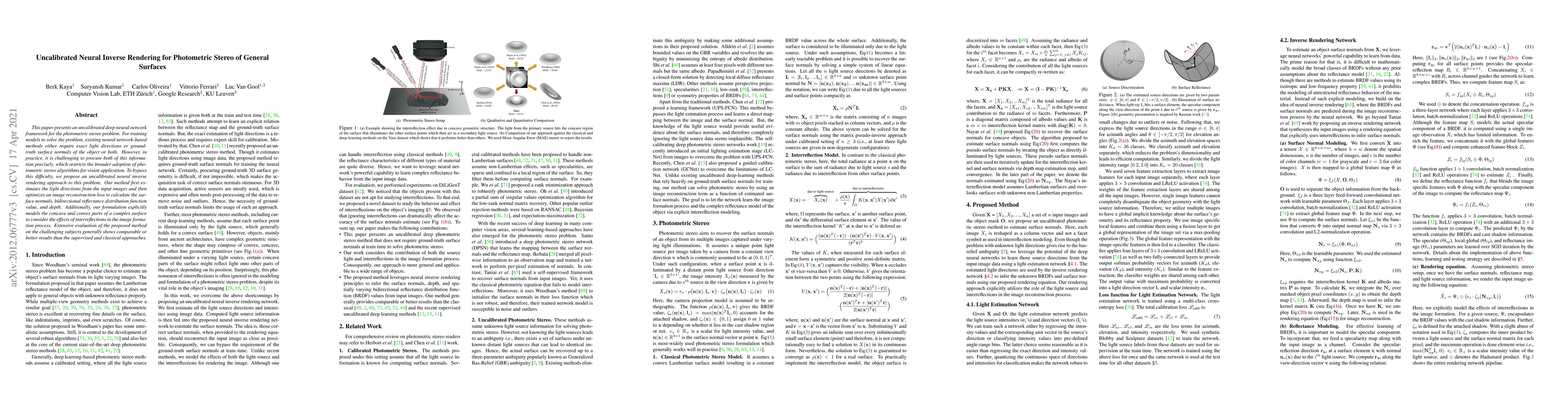 This paper introduces an uncalibrated neural network framework for solving the photometric stereo problem without requiring exact light directions or ground-truth surface normals. It estimates light directions and optimizes an image reconstruction loss to compute surface normals, depth, and reflectance, showing competitive results against supervised and classical methods.