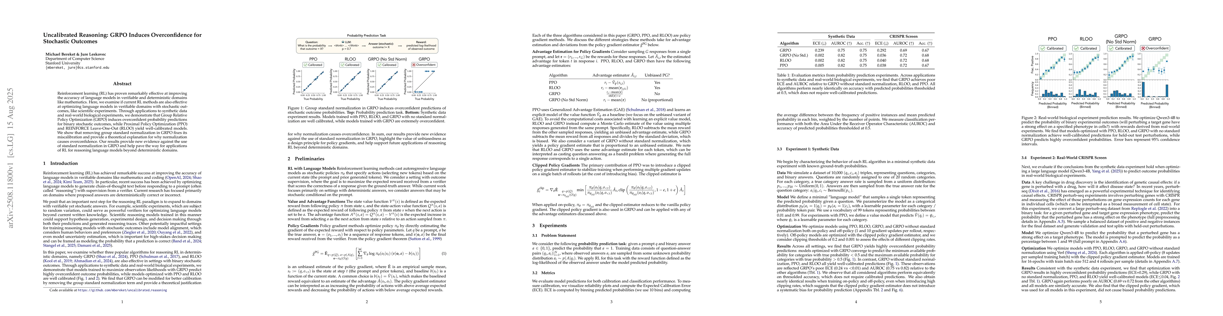 Reinforcement learning (RL) has proven remarkably effective at improving the accuracy of language models in verifiable and deterministic domains like mathematics. Here, we examine if current RL methods are also effective at optimizing language models in verifiable domains with stochastic outcomes, like scientific experiments. Through applications to synthetic data and real-world biological experiments, we demonstrate that Group Relative Policy Optimization (GRPO) induces overconfident probability predictions for binary stochastic outcomes, while Proximal Policy Optimization (PPO) and REINFORCE Leave-One-Out (RLOO) yield well-calibrated models. We show that removing group standard normalization in GRPO fixes its miscalibration and provide a theoretical explanation for why normalization causes overconfidence. Our results provide new evidence against the use of standard normalization in GRPO and help pave the way for applications of RL for reasoning language models beyond deterministic domains.