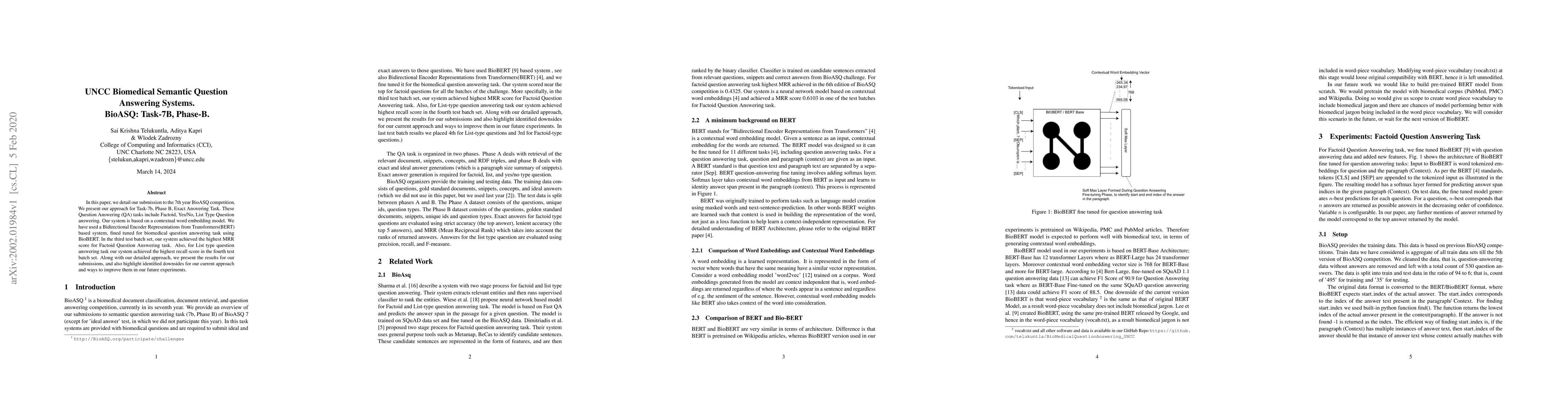 In this paper, we detail our submission to the 2019, 7th year, BioASQ competition. We present our approach for Task-7b, Phase B, Exact Answering Task. These Question Answering (QA) tasks include Factoid, Yes/No, List Type Question answering. Our system is based on a contextual word embedding model. We have used a Bidirectional Encoder Representations from Transformers(BERT) based system, fined tuned for biomedical question answering task using BioBERT. In the third test batch set, our system achieved the highest MRR score for Factoid Question Answering task. Also, for List type question answering task our system achieved the highest recall score in the fourth test batch set. Along with our detailed approach, we present the results for our submissions, and also highlight identified downsides for our current approach and ways to improve them in our future experiments.
