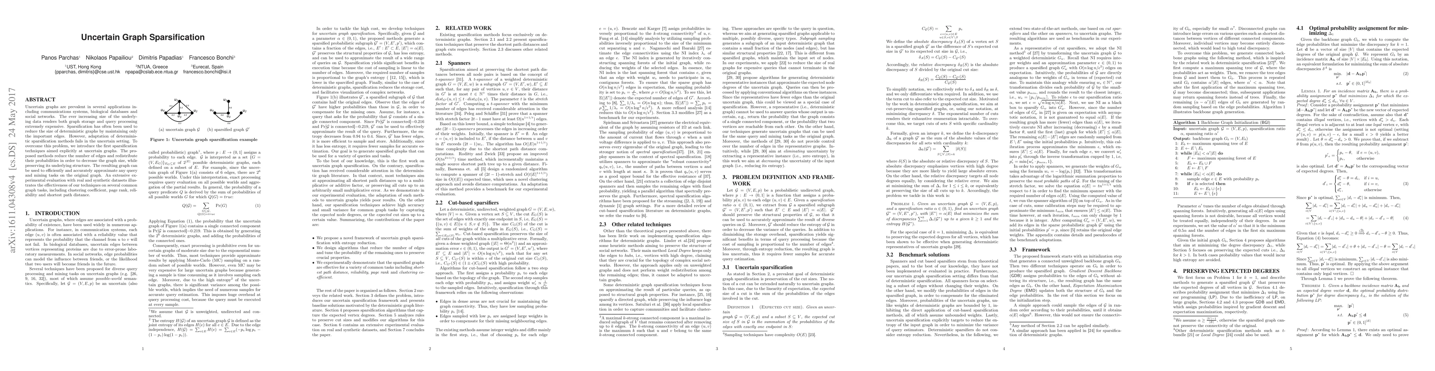 This paper introduces novel sparsification techniques for uncertain graphs, which are common in applications like communications and social networks. The proposed methods reduce graph size while preserving structure and enabling efficient query processing, validated through experiments on various graph tasks.
