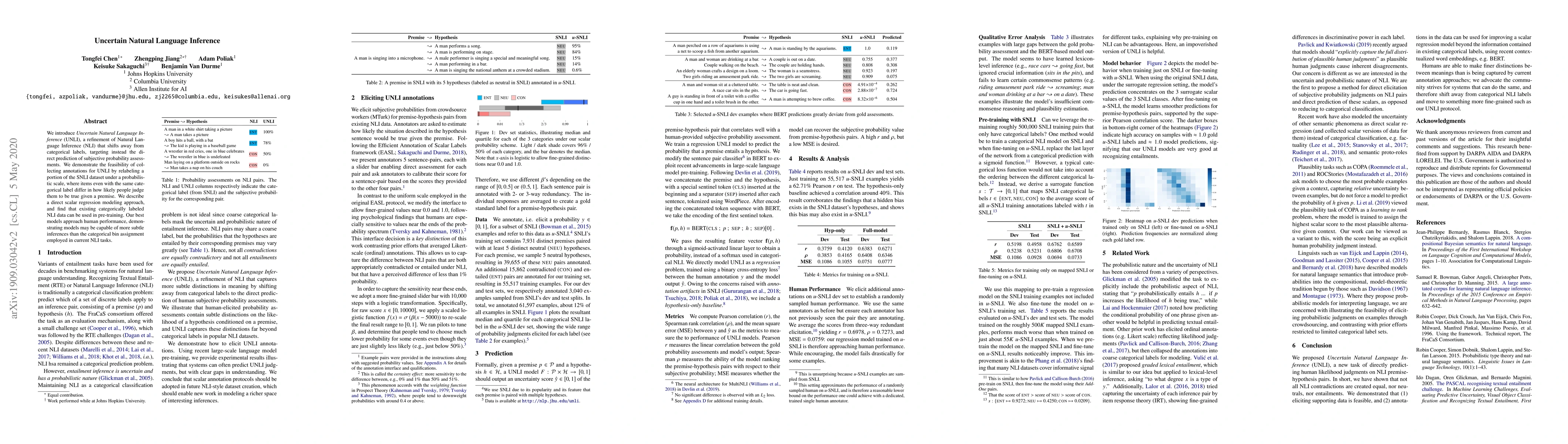 This paper introduces Uncertain Natural Language Inference (UNLI), a probabilistic refinement of NLI, aiming to predict subjective probability assessments instead of categorical labels. The authors demonstrate the collection of UNLI annotations by relabeling SNLI data on a probabilistic scale, and show that pre-training on existing NLI data can improve performance, approaching human-level nuanced inference.