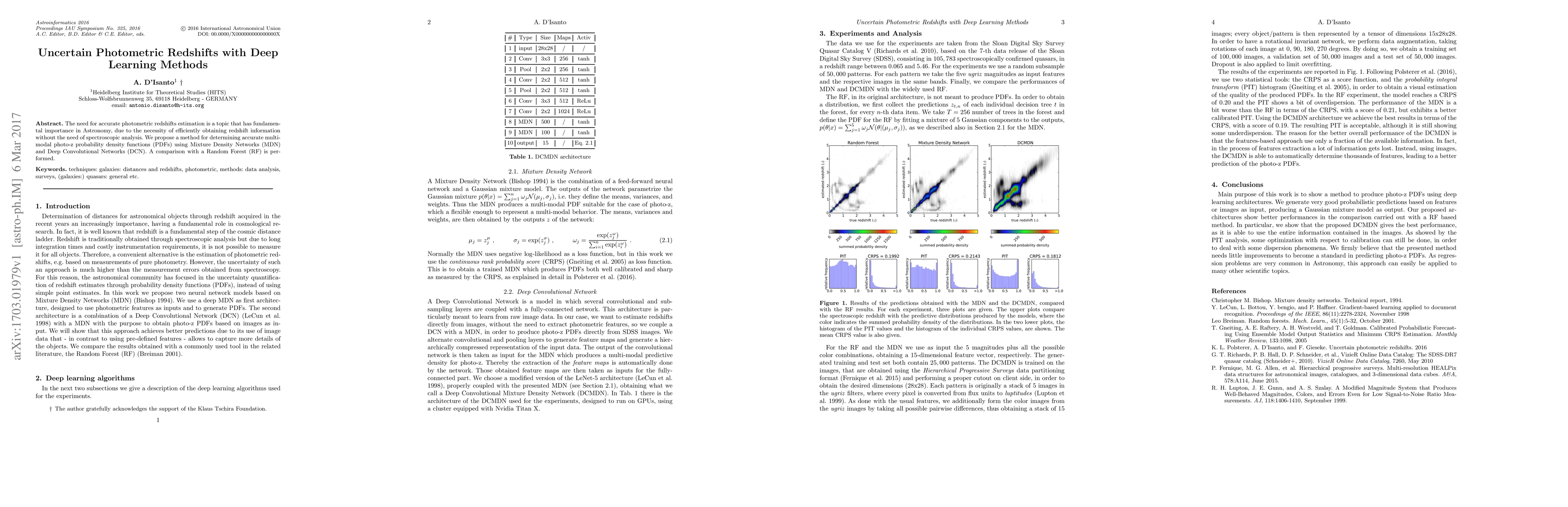 The need for accurate photometric redshifts estimation is a topic that has fundamental importance in Astronomy, due to the necessity of efficiently obtaining redshift information without the need of spectroscopic analysis. We propose a method for determining accurate multimodal photo-z probability density functions (PDFs) using Mixture Density Networks (MDN) and Deep Convolutional Networks (DCN). A comparison with a Random Forest (RF) is performed.