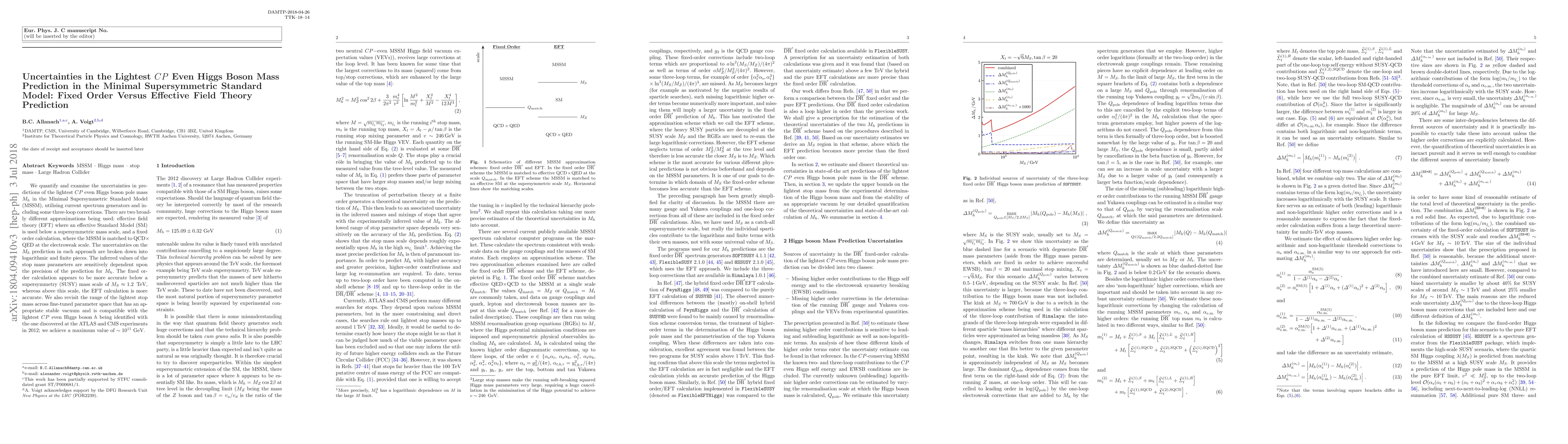 This paper investigates uncertainties in predicting the lightest $CP$ even Higgs boson mass $M_h$ in the Minimal Supersymmetric Standard Model (MSSM), comparing fixed order calculations and effective field theory (EFT) approaches. The study finds that fixed order calculations are more precise below a SUSY mass scale of $M_S \approx 1.2$ TeV, while EFT calculations are more accurate above this scale. The paper also explores the range of the lightest stop mass in fine-tuned parameter space.