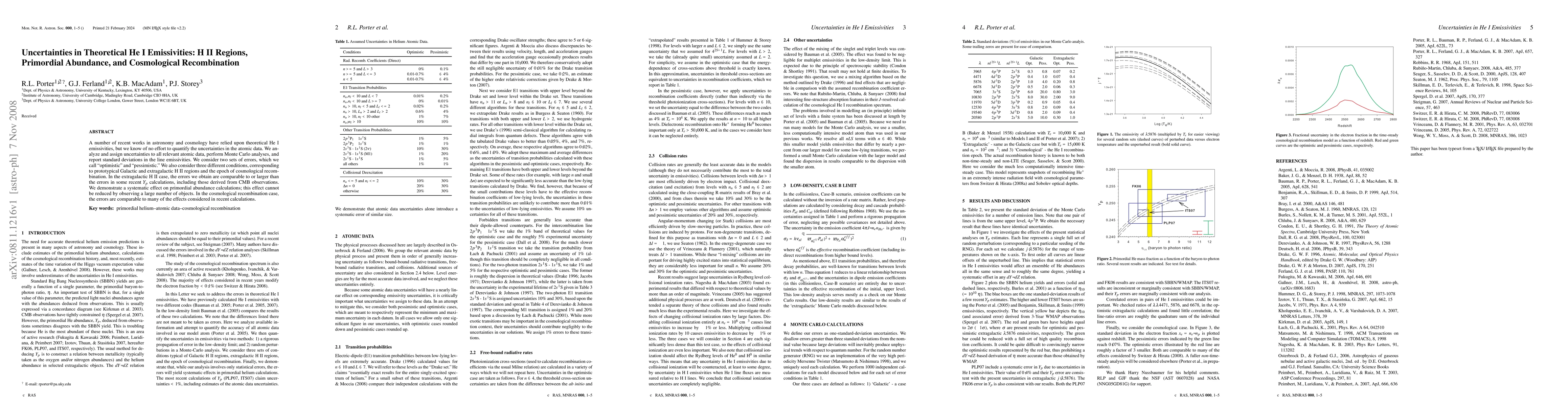 A number of recent works in astronomy and cosmology have relied upon theoretical He I emissivities, but we know of no effort to quantify the uncertainties in the atomic data. We analyze and assign uncertainties to all relevant atomic data, perform Monte Carlo analyses, and report standard deviations in the line emissivities. We consider two sets of errors, which we call "optimistic" and "pessimistic." We also consider three different conditions, corresponding to prototypical Galactic and extragalactic H II regions and the epoch of cosmological recombination. In the extragalactic H II case, the errors we obtain are comparable to or larger than the errors in some recent $Y_p$ calculations, including those derived from CMB observations. We demonstrate a systematic effect on primordial abundance calculations; this effect cannot be reduced by observing a large number of objects. In the cosmological recombination case, the errors are comparable to many of the effects considered in recent calculations.