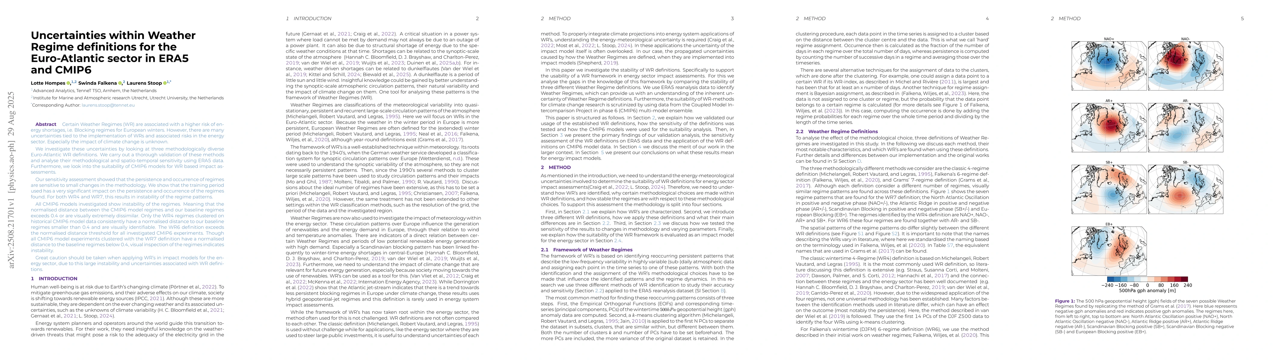 Certain Weather Regimes (WR) are associated with a higher risk of energy shortages, i.e. Blocking regimes for European winters. However, there are many uncertainties tied to the implementation of WRs and associated risks in the energy sector. Especially the impact of climate change is unknown. We investigate these uncertainties by looking at three methodologically diverse Euro-Atlantic WR definitions. We carry out a thorough validation of these methods and analyse their methodological and spatio-temporal sensitivity using ERA5 data. Furthermore, we look into the suitability of CMIP6 models for WR based impact assessments. Our sensitivity assessment showed that the persistence and occurrence of regimes are sensitive to small changes in the methodology. We show that the training period used has a very significant impact on the persistence and occurrence of the regimes found. For both WR4 and WR7, this results in instability of the regime patterns. All CMIP6 models investigated show instability of the regimes. Meaning that the normalised distance between the CMIP6 model regimes and our baseline regimes exceeds 0.4 or are visually extremely dissimilar. Only the WR4 regimes clustered on historical CMIP6 model data consistently have a normalised distance to our baseline regimes smaller than 0.4 and are visually identifiable. The WR6 definition exceeds the normalised distance threshold for all investigated CMIP6 experiments. Though all CMIP6 model experiments clustered with the WR7 definition have a normalised distance to the baseline regimes below 0.4, visual inspection of the regimes indicates instability. Great caution should be taken when applying WR's in impact models for the energy sector, due to this large instability and uncertainties associated with WR definitions.