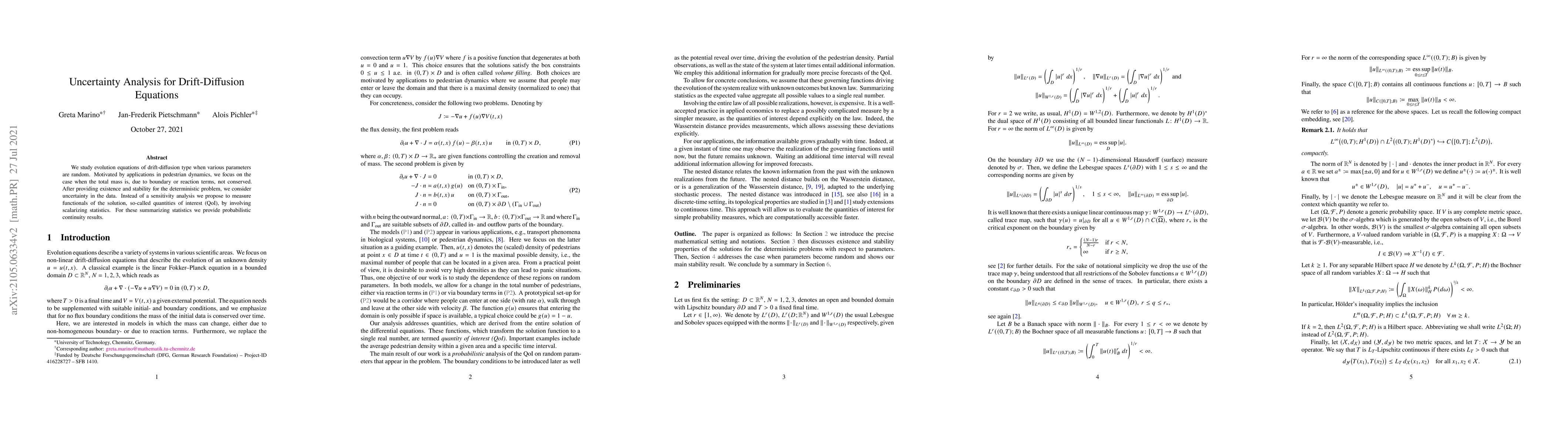 We study evolution equations of drift-diffusion type when various parameters are random. Motivated by applications in pedestrian dynamics, we focus on the case when the total mass is, due to boundary or reaction terms, not conserved. After providing existence and stability for the deterministic problem, we consider uncertainty in the data. Instead of a sensitivity analysis we propose to measure functionals of the solution, so-called quantities of interest (QoI), by involving scalarizing statistics. For these summarizing statistics we provide probabilistic continuity results.