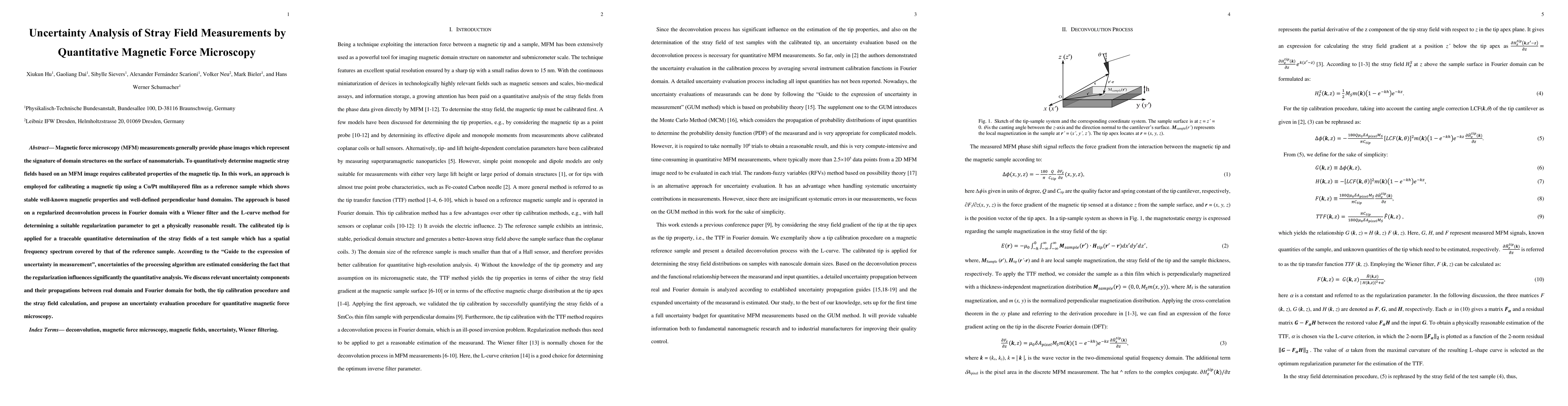 This paper presents a method for calibrating magnetic tips in magnetic force microscopy using a Co/Pt multilayered film as a reference, employing a regularized deconvolution process. The study estimates uncertainties in the processing algorithm, discussing relevant components and their propagation, and proposes an evaluation procedure for quantitative analysis of stray fields.