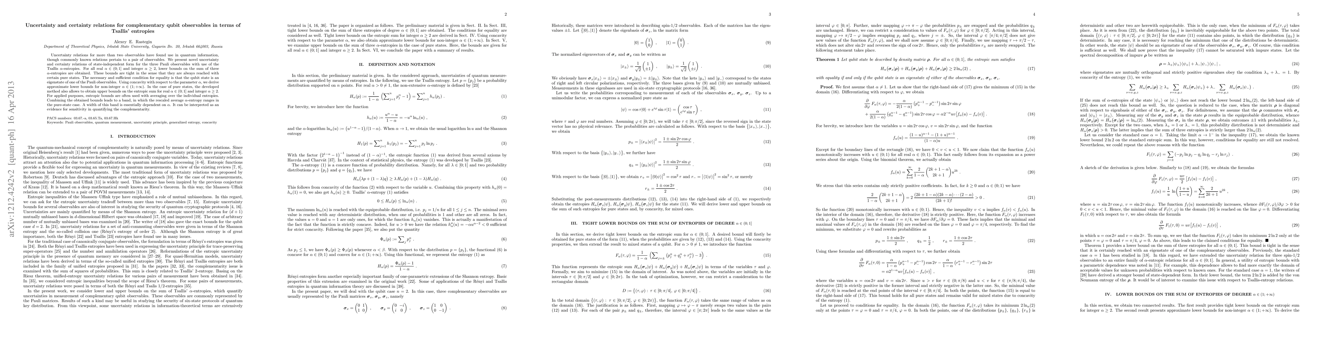 Uncertainty relations for more than two observables have found use in quantum information, though commonly known relations pertain to a pair of observables. We present novel uncertainty and certainty relations of state-independent form for the three Pauli observables with use of the Tsallis $\alpha$-entropies. For all real $\alpha\in(0;1]$ and integer $\alpha\geq2$, lower bounds on the sum of three $\alpha$-entropies are obtained. These bounds are tight in the sense that they are always reached with certain pure states. The necessary and sufficient condition for equality is that the qubit state is an eigenstate of one of the Pauli observables. Using concavity with respect to the parameter $\alpha$, we derive approximate lower bounds for non-integer $\alpha\in(1;+\infty)$. In the case of pure states, the developed method also allows to obtain upper bounds on the entropic sum for real $\alpha\in(0;1]$ and integer $\alpha\geq2$. For applied purposes, entropic bounds are often used with averaging over the individual entropies. Combining the obtained bounds leads to a band, in which the rescaled average $\alpha$-entropy ranges in the pure-state case. A width of this band is essentially dependent on $\alpha$. It can be interpreted as an evidence for sensitivity in quantifying the complementarity.
