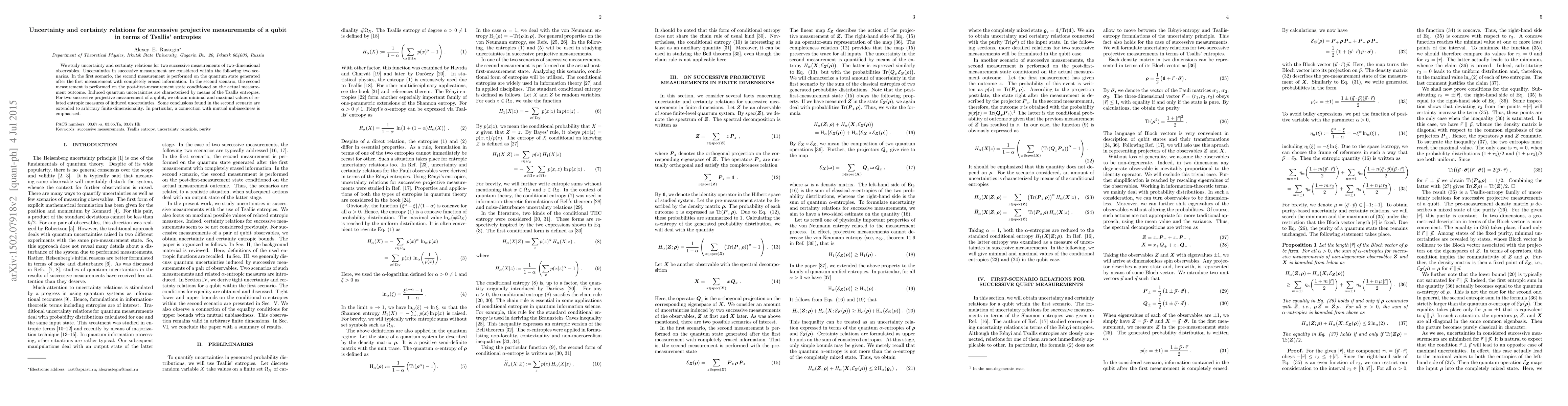 This paper investigates uncertainty and certainty relations for two successive projective measurements of a qubit using Tsallis entropies. It examines two scenarios: one with complete information erasure between measurements and one with conditioning on the first measurement outcome, deriving minimal and maximal entropic measures of induced uncertainties.