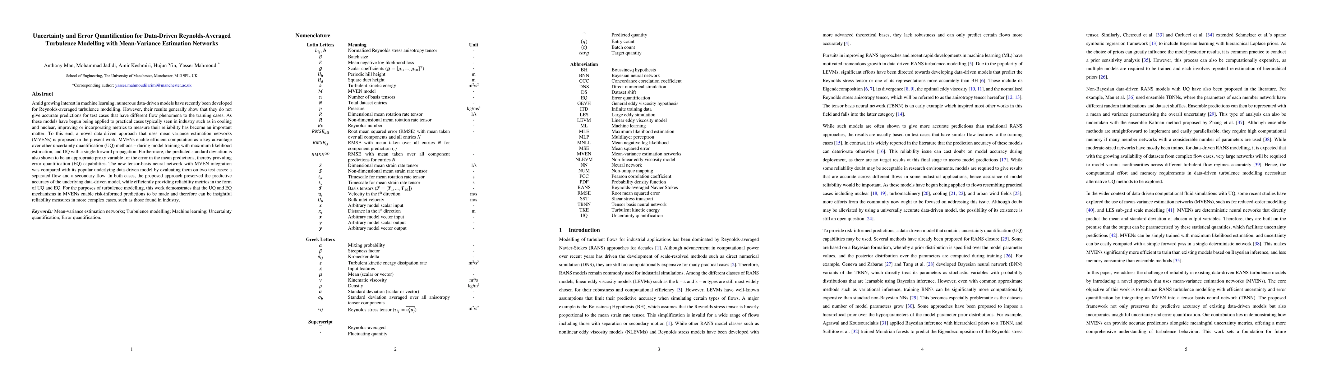 The research proposes a novel data-driven approach using mean-variance estimation networks (MVENs) for uncertainty quantification (UQ) and error quantification (EQ) in Reynolds-averaged turbulence modelling. MVENs are trained with maximum likelihood estimation, allowing efficient UQ through single forward propagation, and the predicted standard deviation serves as a proxy for error in mean predictions.