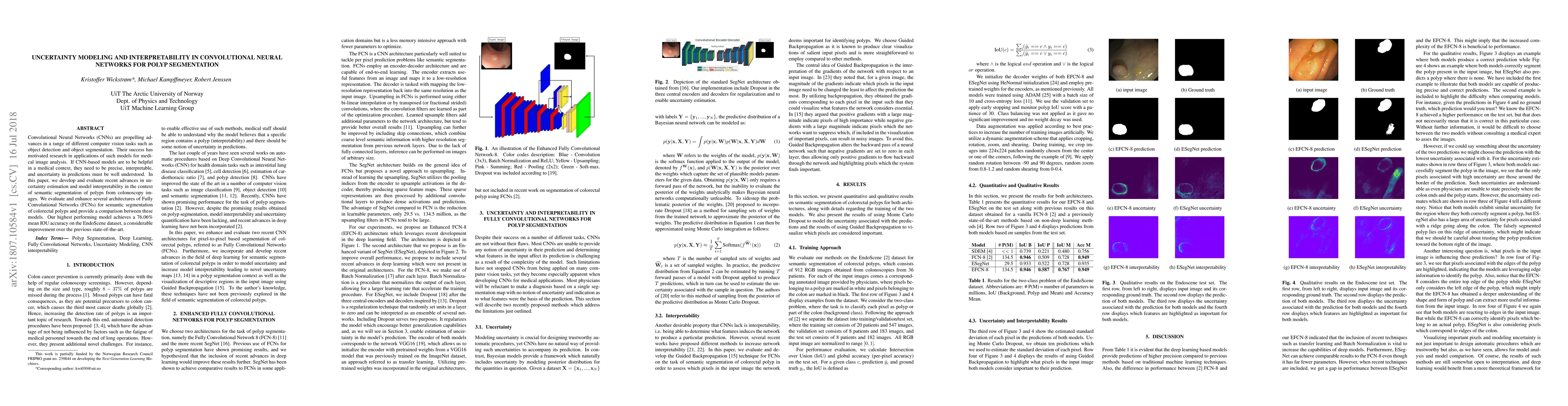 This paper explores the use of Convolutional Neural Networks (CNNs) for semantic segmentation of colorectal polyps in colonoscopy images, focusing on improving model interpretability and uncertainty estimation. The study evaluates various Fully Convolutional Networks (FCNs) and reports a 76.06% mean IOU accuracy, surpassing previous state-of-the-art methods.