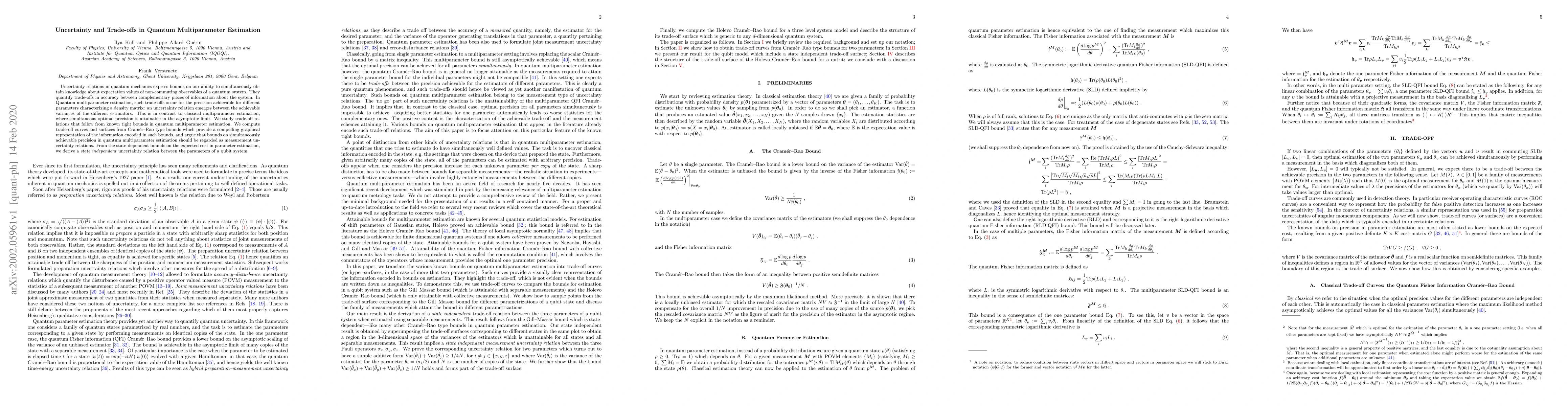 This paper investigates uncertainty relations in quantum multiparameter estimation, revealing trade-offs in precision for different parameters of a quantum system. It derives state-independent uncertainty relations from state-dependent bounds, contrasting with classical systems where optimal precision is achievable.