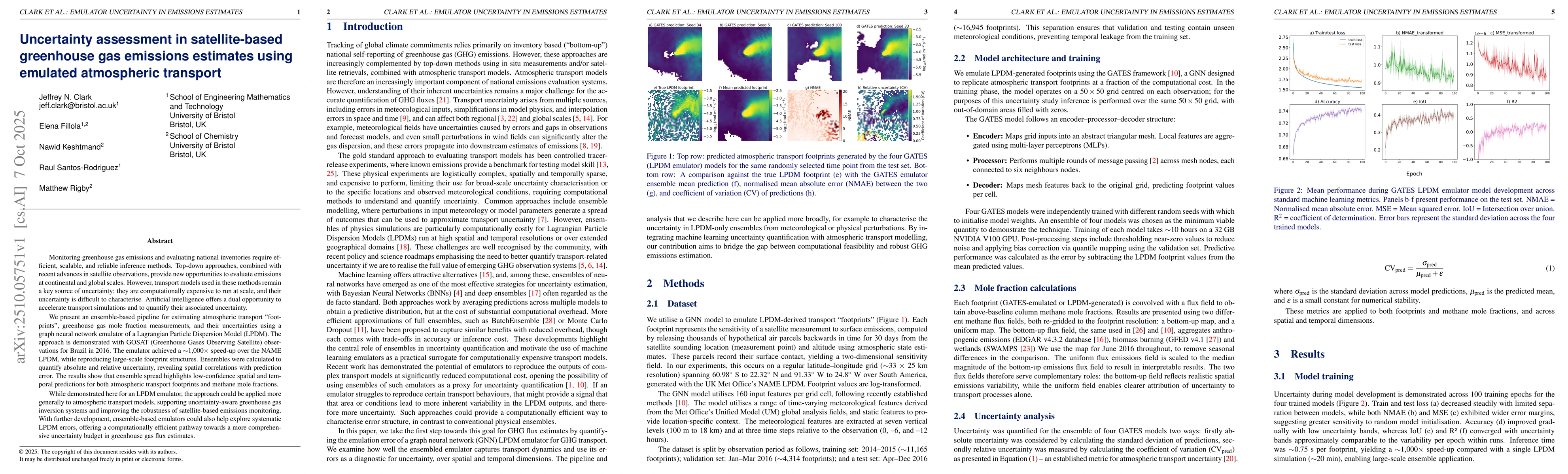 The work introduces an ensemble-based GNN emulator that combines speed and uncertainty quantification for atmospheric transport, offering a novel approach to improve the reliability of satellite-based greenhouse gas emission estimates.
