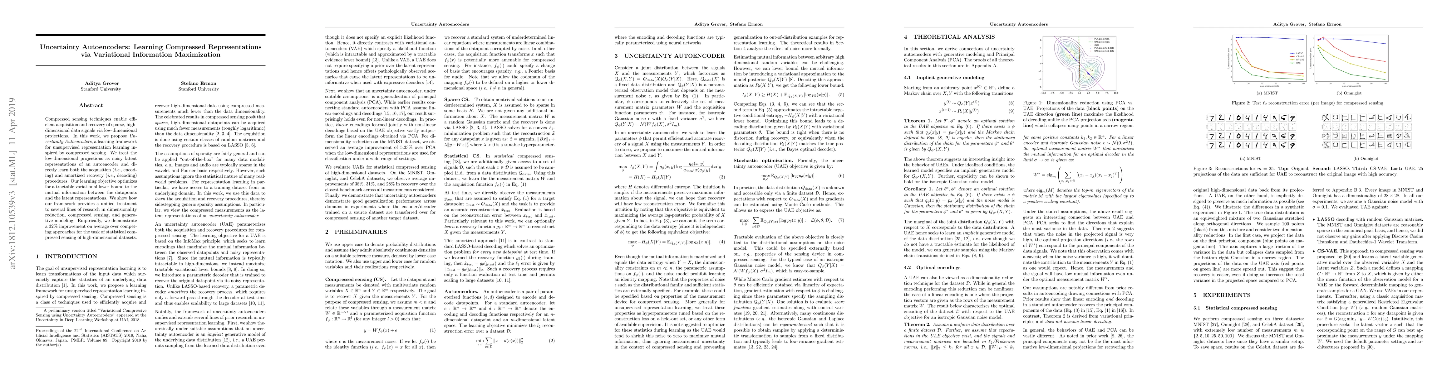 Compressed sensing techniques enable efficient acquisition and recovery of sparse, high-dimensional data signals via low-dimensional projections. In this work, we propose Uncertainty Autoencoders, a learning framework for unsupervised representation learning inspired by compressed sensing. We treat the low-dimensional projections as noisy latent representations of an autoencoder and directly learn both the acquisition (i.e., encoding) and amortized recovery (i.e., decoding) procedures. Our learning objective optimizes for a tractable variational lower bound to the mutual information between the datapoints and the latent representations. We show how our framework provides a unified treatment to several lines of research in dimensionality reduction, compressed sensing, and generative modeling. Empirically, we demonstrate a 32% improvement on average over competing approaches for the task of statistical compressed sensing of high-dimensional datasets.
