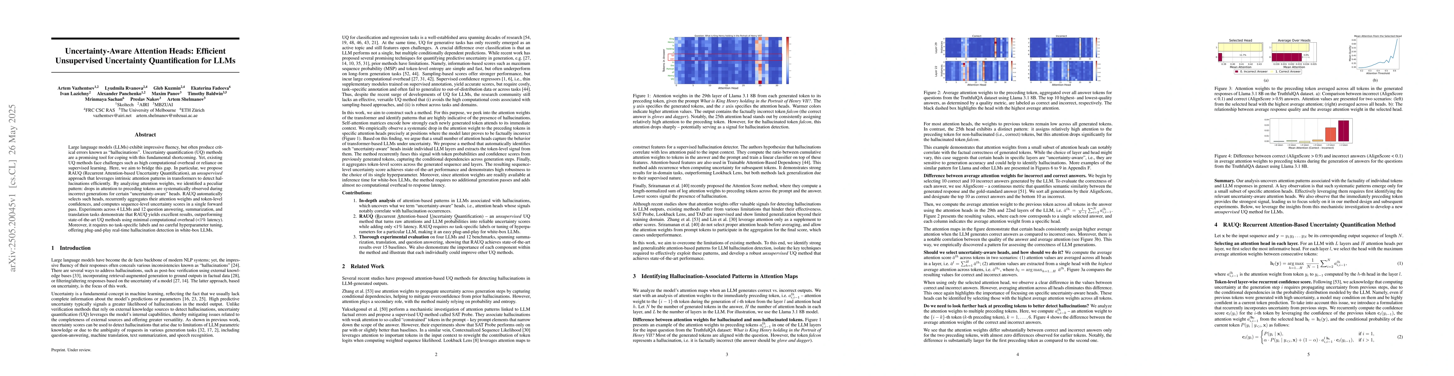The main technical contribution is the development of RAUQ, a recurrent attention-based unsupervised uncertainty quantification method that efficiently detects hallucinations in LLMs by analyzing attention patterns.