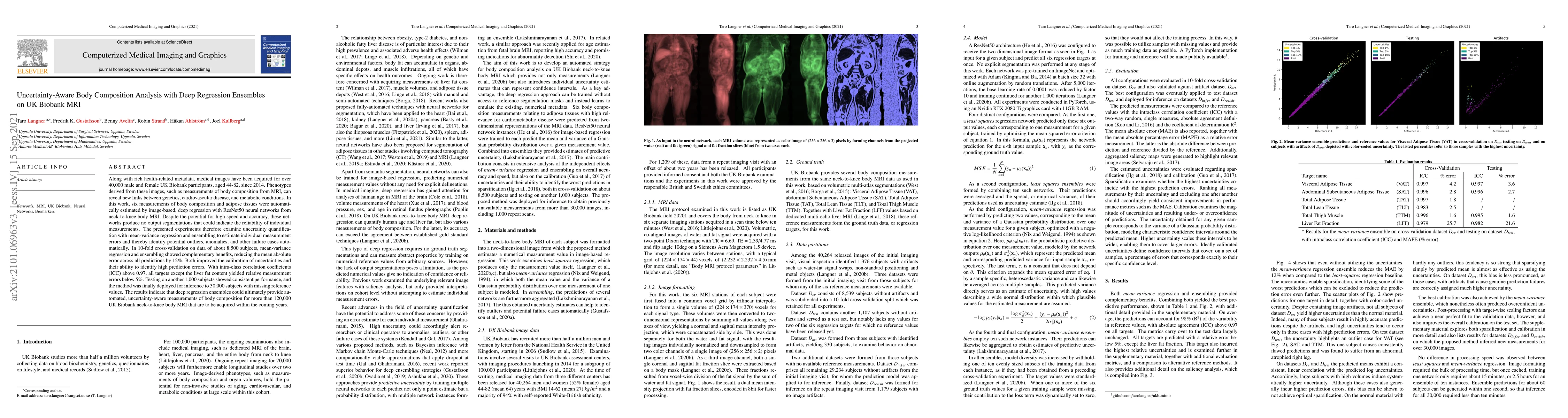 This paper presents a deep regression ensemble approach using ResNet50 neural networks to estimate body composition from UK Biobank MRI scans, incorporating uncertainty quantification to improve accuracy and reliability. The method reduces mean absolute error by 12% and achieves high calibration of uncertainties, demonstrating potential for automated analysis of over 120,000 future MRI scans.
