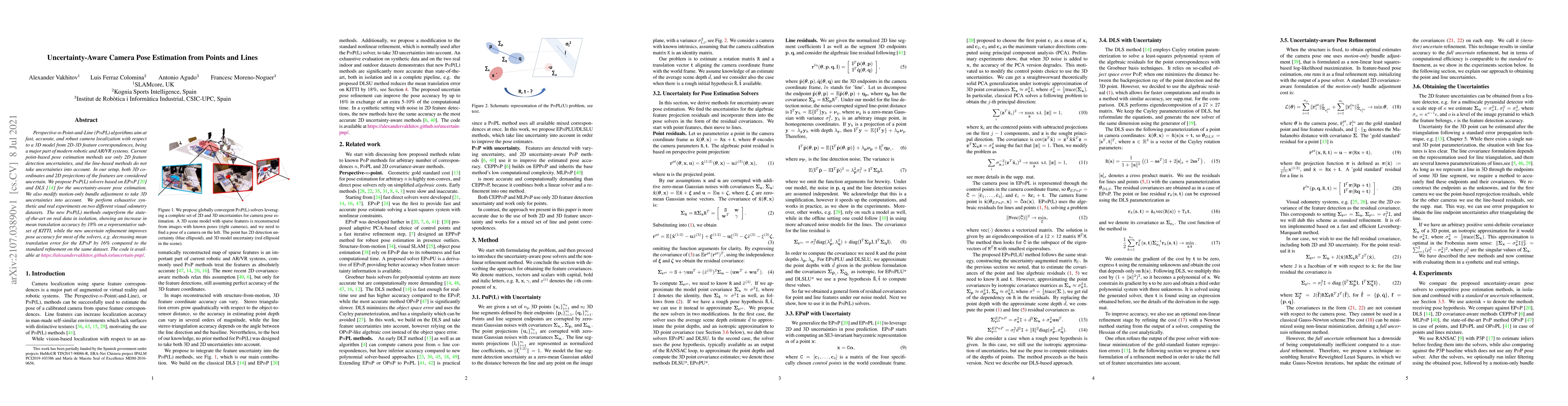 Perspective-n-Point-and-Line (P$n$PL) algorithms aim at fast, accurate, and robust camera localization with respect to a 3D model from 2D-3D feature correspondences, being a major part of modern robotic and AR/VR systems. Current point-based pose estimation methods use only 2D feature detection uncertainties, and the line-based methods do not take uncertainties into account. In our setup, both 3D coordinates and 2D projections of the features are considered uncertain. We propose PnP(L) solvers based on EPnP and DLS for the uncertainty-aware pose estimation. We also modify motion-only bundle adjustment to take 3D uncertainties into account. We perform exhaustive synthetic and real experiments on two different visual odometry datasets. The new PnP(L) methods outperform the state-of-the-art on real data in isolation, showing an increase in mean translation accuracy by 18% on a representative subset of KITTI, while the new uncertain refinement improves pose accuracy for most of the solvers, e.g. decreasing mean translation error for the EPnP by 16% compared to the standard refinement on the same dataset. The code is available at https://alexandervakhitov.github.io/uncertain-pnp/.