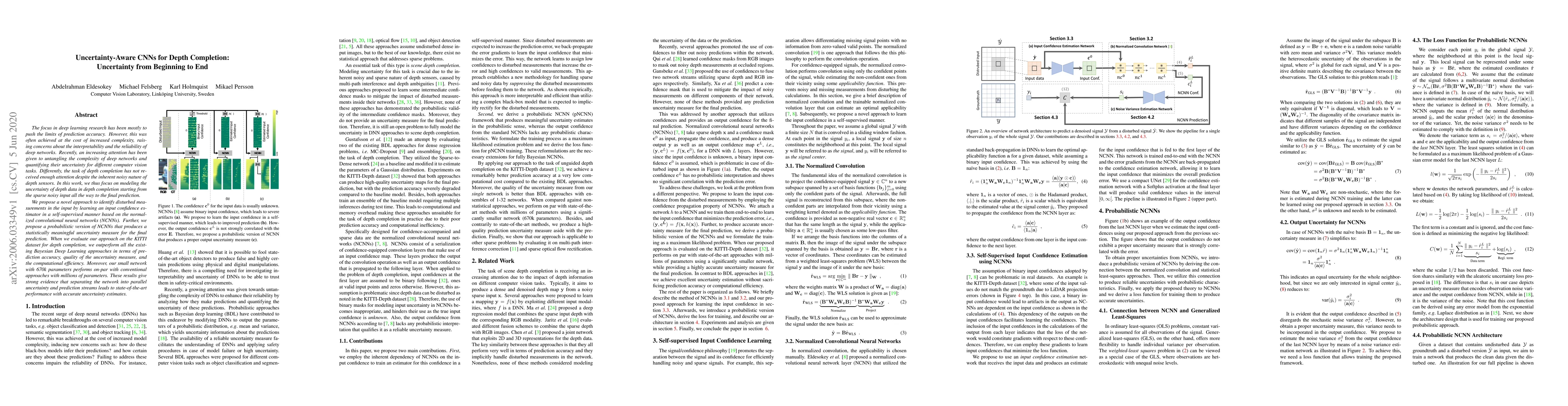The focus in deep learning research has been mostly to push the limits of prediction accuracy. However, this was often achieved at the cost of increased complexity, raising concerns about the interpretability and the reliability of deep networks. Recently, an increasing attention has been given to untangling the complexity of deep networks and quantifying their uncertainty for different computer vision tasks. Differently, the task of depth completion has not received enough attention despite the inherent noisy nature of depth sensors. In this work, we thus focus on modeling the uncertainty of depth data in depth completion starting from the sparse noisy input all the way to the final prediction. We propose a novel approach to identify disturbed measurements in the input by learning an input confidence estimator in a self-supervised manner based on the normalized convolutional neural networks (NCNNs). Further, we propose a probabilistic version of NCNNs that produces a statistically meaningful uncertainty measure for the final prediction. When we evaluate our approach on the KITTI dataset for depth completion, we outperform all the existing Bayesian Deep Learning approaches in terms of prediction accuracy, quality of the uncertainty measure, and the computational efficiency. Moreover, our small network with 670k parameters performs on-par with conventional approaches with millions of parameters. These results give strong evidence that separating the network into parallel uncertainty and prediction streams leads to state-of-the-art performance with accurate uncertainty estimates.
