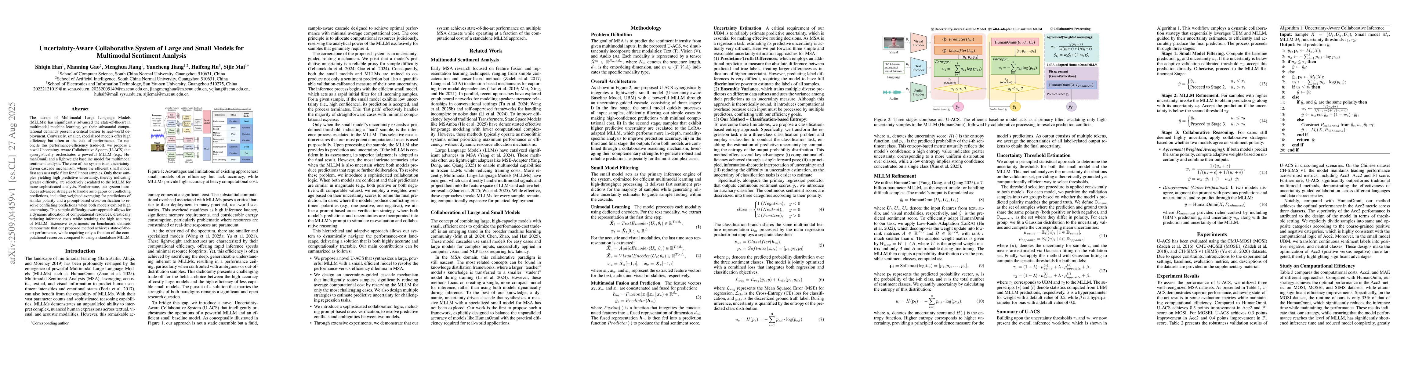 The advent of Multimodal Large Language Models (MLLMs) has significantly advanced the state-of-the-art in multimodal machine learning, yet their substantial computational demands present a critical barrier to real-world deployment. Conversely, smaller, specialized models offer high efficiency but often at the cost of performance. To reconcile this performance-efficiency trade-off, we propose a novel Uncertainty-Aware Collaborative System (U-ACS) that synergistically orchestrates a powerful MLLM (e.g., HumanOmni) and a lightweight baseline model for multimodal sentiment analysis. The core of our system is an uncertainty-driven cascade mechanism, where the efficient small model first acts as a rapid filter for all input samples. Only those samples yielding high predictive uncertainty, thereby indicating greater difficulty, are selectively escalated to the MLLM for more sophisticated analysis. Furthermore, our system introduces advanced strategies to handle ambiguous or conflicting predictions, including weighted averaging for predictions of similar polarity and a prompt-based cross-verification to resolve conflicting predictions when both models exhibit high uncertainty. This sample-difficulty-aware approach allows for a dynamic allocation of computational resources, drastically reducing inference costs while retaining the high accuracy of MLLM. Extensive experiments on benchmark datasets demonstrate that our proposed method achieves state-of-the-art performance, while requiring only a fraction of the computational resources compared to using a standalone MLLM.