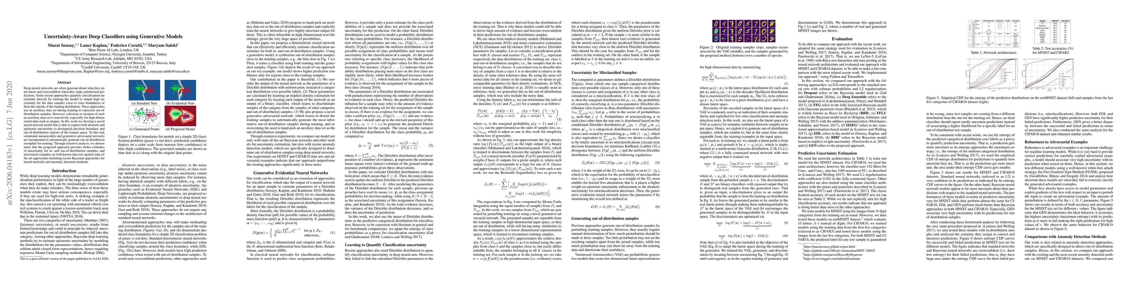 Deep neural networks are often ignorant about what they do not know and overconfident when they make uninformed predictions. Some recent approaches quantify classification uncertainty directly by training the model to output high uncertainty for the data samples close to class boundaries or from the outside of the training distribution. These approaches use an auxiliary data set during training to represent out-of-distribution samples. However, selection or creation of such an auxiliary data set is non-trivial, especially for high dimensional data such as images. In this work we develop a novel neural network model that is able to express both aleatoric and epistemic uncertainty to distinguish decision boundary and out-of-distribution regions of the feature space. To this end, variational autoencoders and generative adversarial networks are incorporated to automatically generate out-of-distribution exemplars for training. Through extensive analysis, we demonstrate that the proposed approach provides better estimates of uncertainty for in- and out-of-distribution samples, and adversarial examples on well-known data sets against state-of-the-art approaches including recent Bayesian approaches for neural networks and anomaly detection methods.