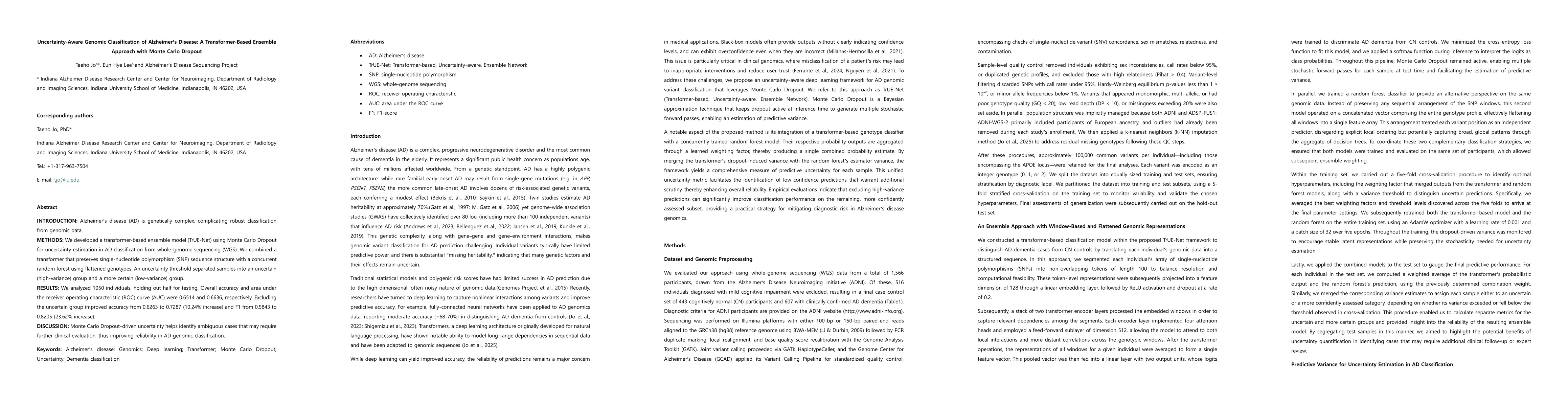 INTRODUCTION: Alzheimer's disease (AD) is genetically complex, complicating robust classification from genomic data. METHODS: We developed a transformer-based ensemble model (TrUE-Net) using Monte Carlo Dropout for uncertainty estimation in AD classification from whole-genome sequencing (WGS). We combined a transformer that preserves single-nucleotide polymorphism (SNP) sequence structure with a concurrent random forest using flattened genotypes. An uncertainty threshold separated samples into an uncertain (high-variance) group and a more certain (low-variance) group. RESULTS: We analyzed 1050 individuals, holding out half for testing. Overall accuracy and area under the receiver operating characteristic (ROC) curve (AUC) were 0.6514 and 0.6636, respectively. Excluding the uncertain group improved accuracy from 0.6263 to 0.7287 (10.24% increase) and F1 from 0.5843 to 0.8205 (23.62% increase). DISCUSSION: Monte Carlo Dropout-driven uncertainty helps identify ambiguous cases that may require further clinical evaluation, thus improving reliability in AD genomic classification.